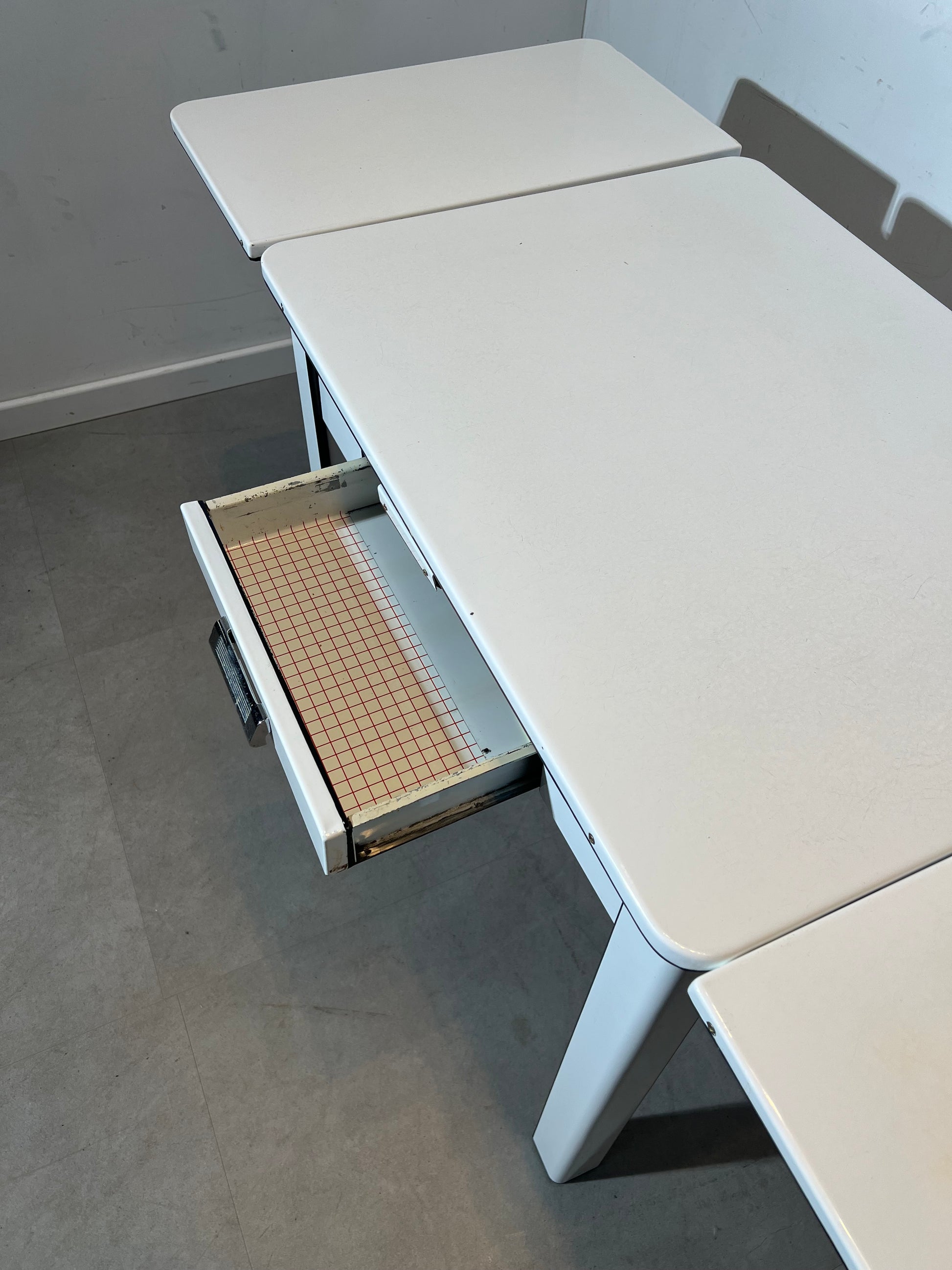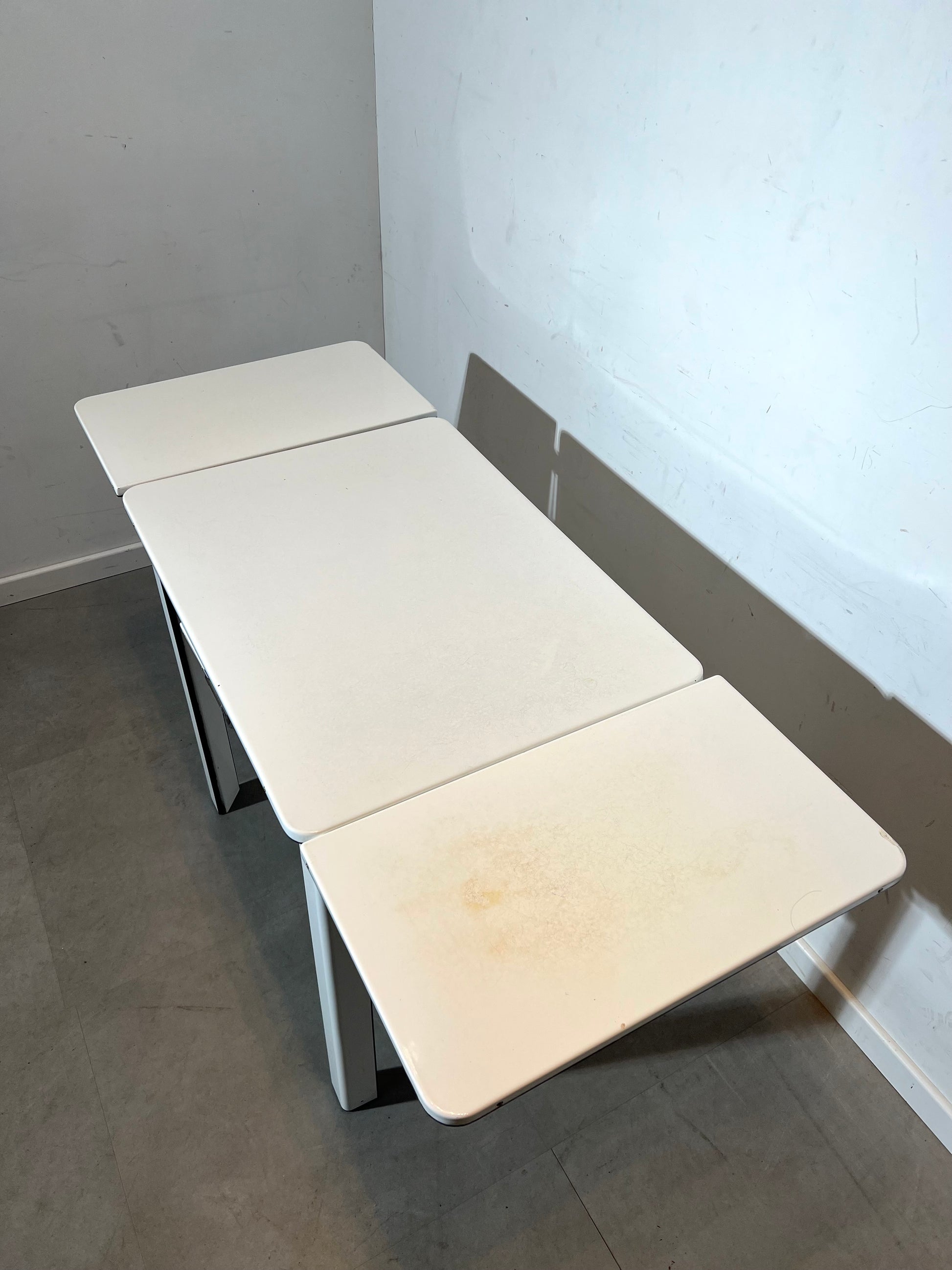 Authentic 1950s vintage drop-leaf table featuring a clean white Formica top and minimalist metal frame. This functional mid-century piece is designed with two fold-out side leaves, allowing you to easily adapt the table size depending on your space or needs.