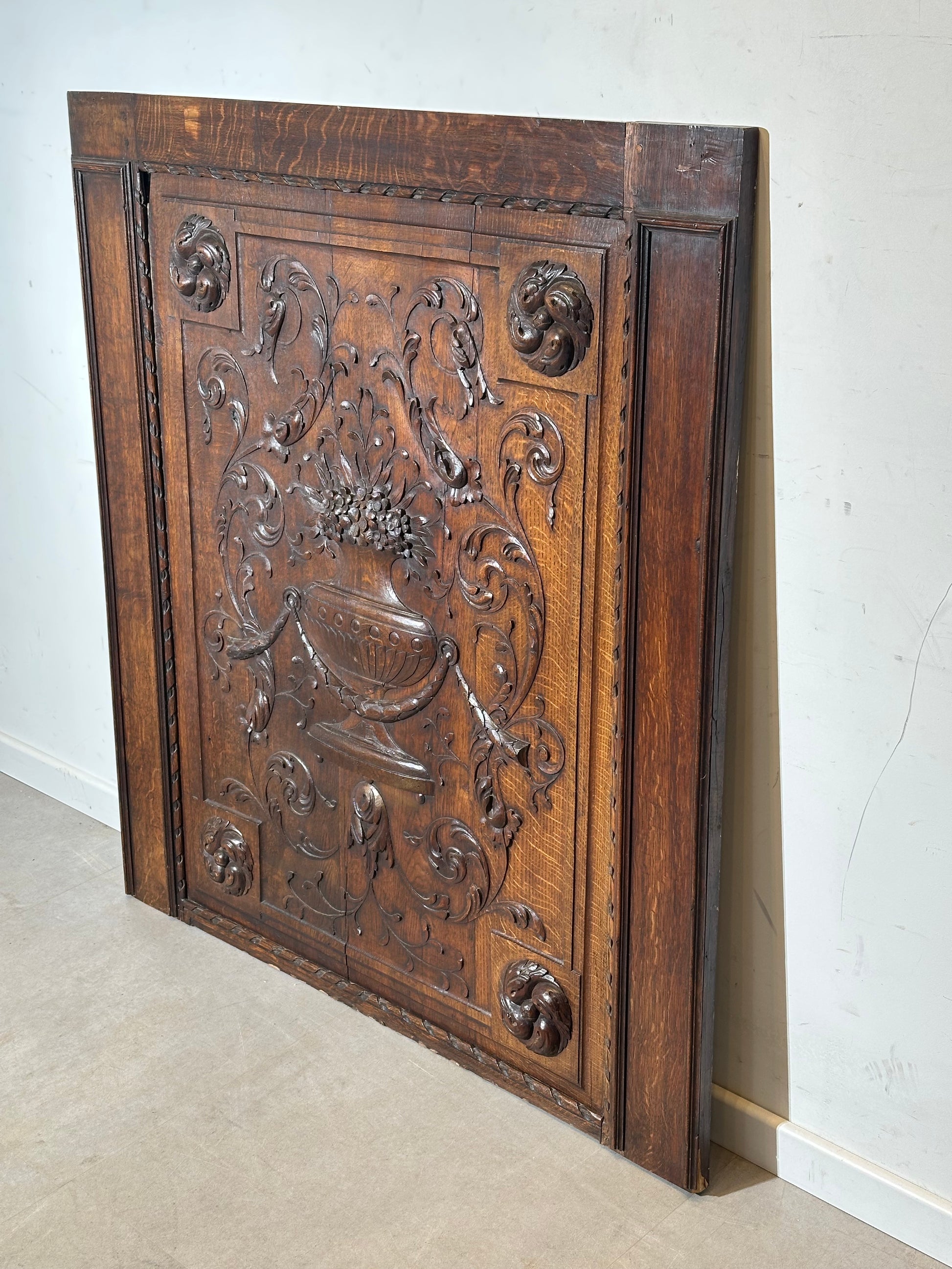 Impressive 19th century carved oak panel featuring an elegant floral urn motif with rich scrollwork and deep relief details. This unique piece was originally part of antique furniture or architectural woodwork and is now perfect as a decorative wall panel, headboard element or statement piece in an interior.