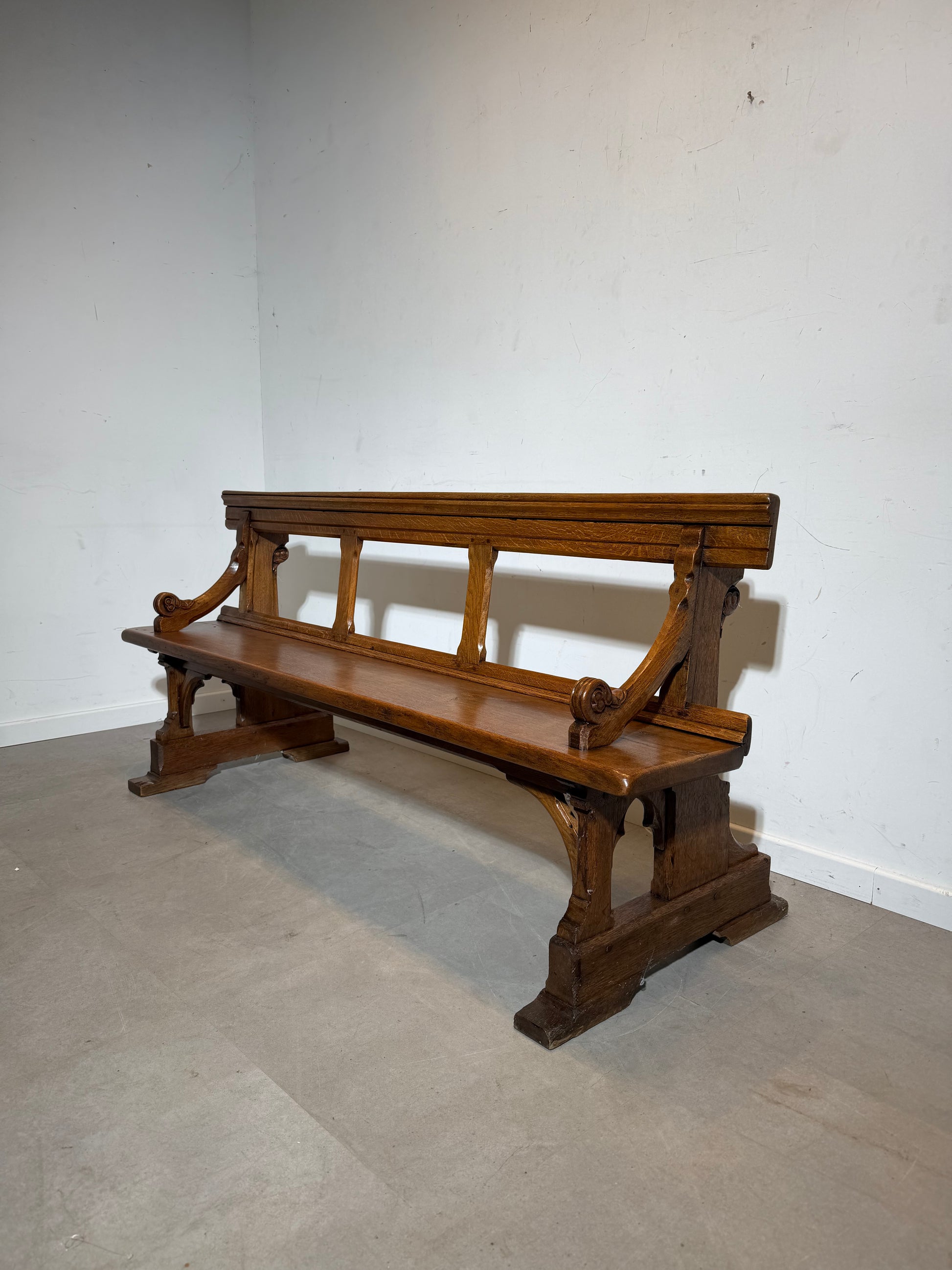 Authentic 19th century church bench crafted in solid oak, featuring a beautifully aged patina and timeless architectural lines. This piece has a strong, sturdy construction with elegant scroll arm details and classic trestle-style bases, making it both practical and highly decorative.