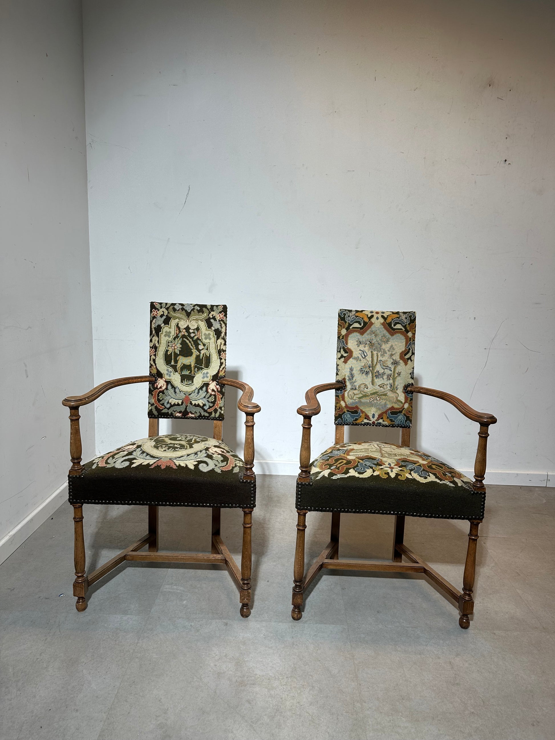 The tapestry upholstery is decorated with pastoral and floral motifs, showcasing traditional craftsmanship and timeless character. With their warm patina and intricate details, these armchairs add sophistication to any interior – from a classic dining room to a decorative accent in a study or hallway.