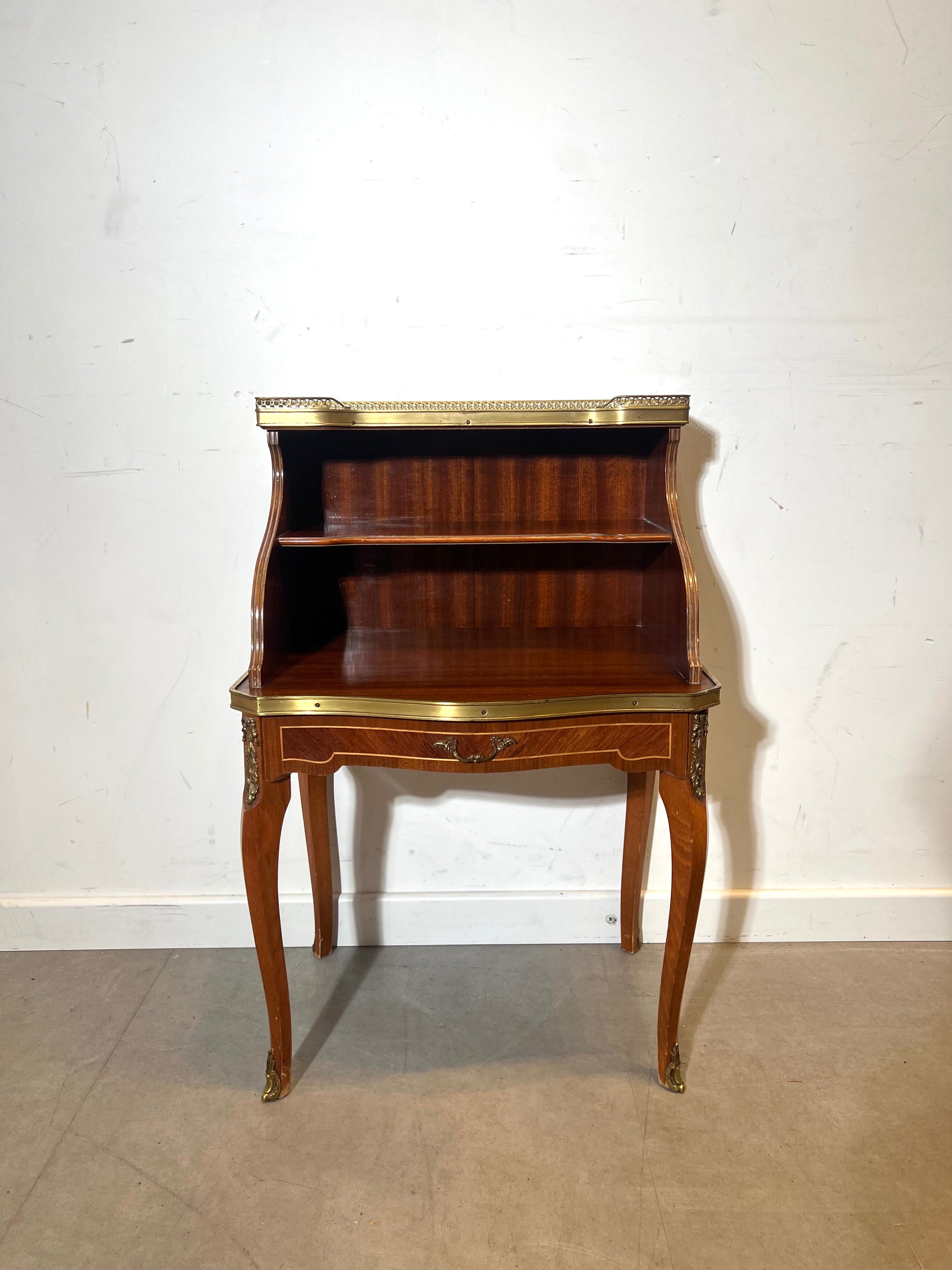 The top is finished with a light marble surface surrounded by a pierced brass gallery, giving the table both a luxurious look and practical functionality. Beneath the marble top is a small open shelving section, ideal for storing letters, books or decorative objects.