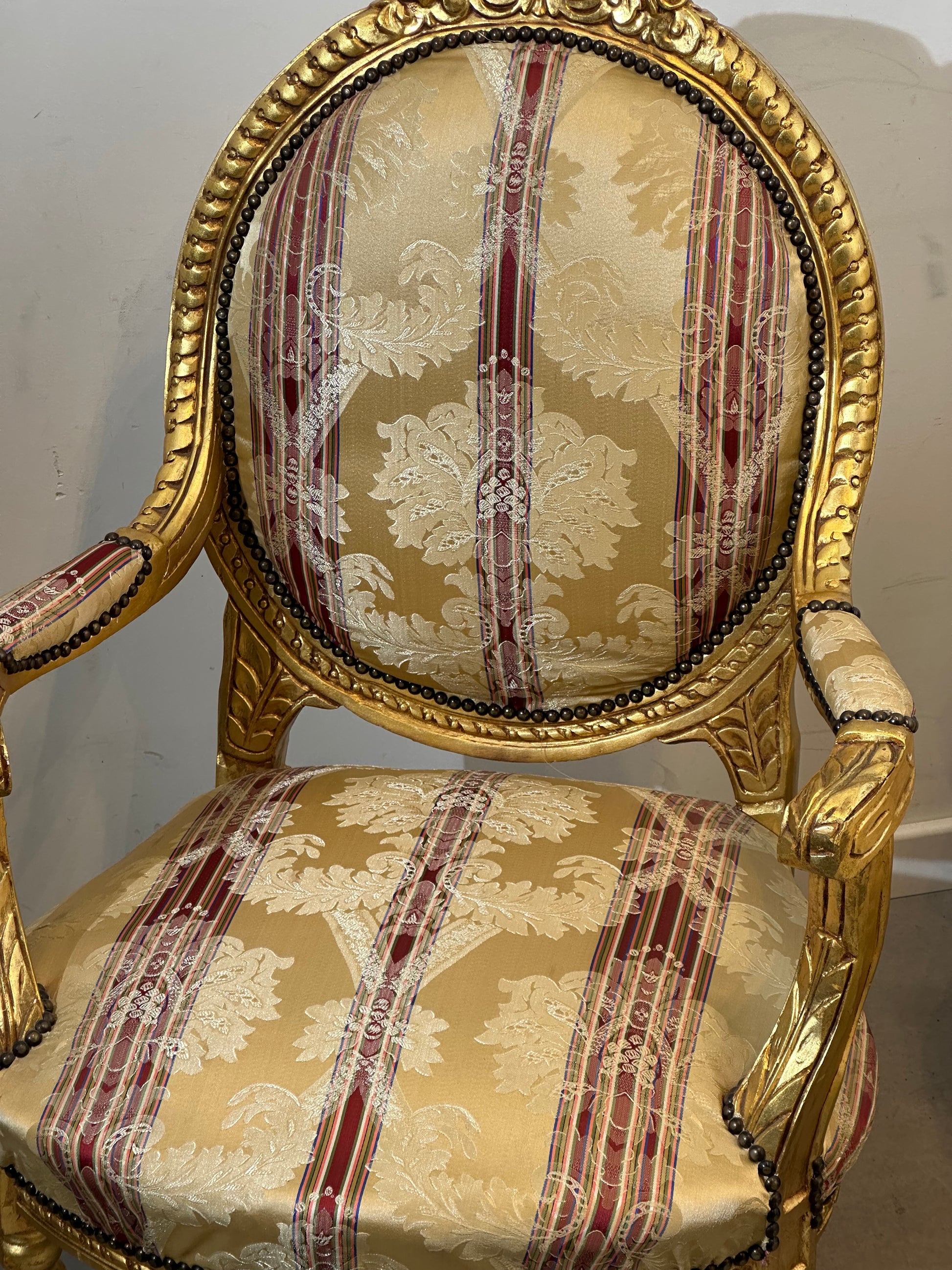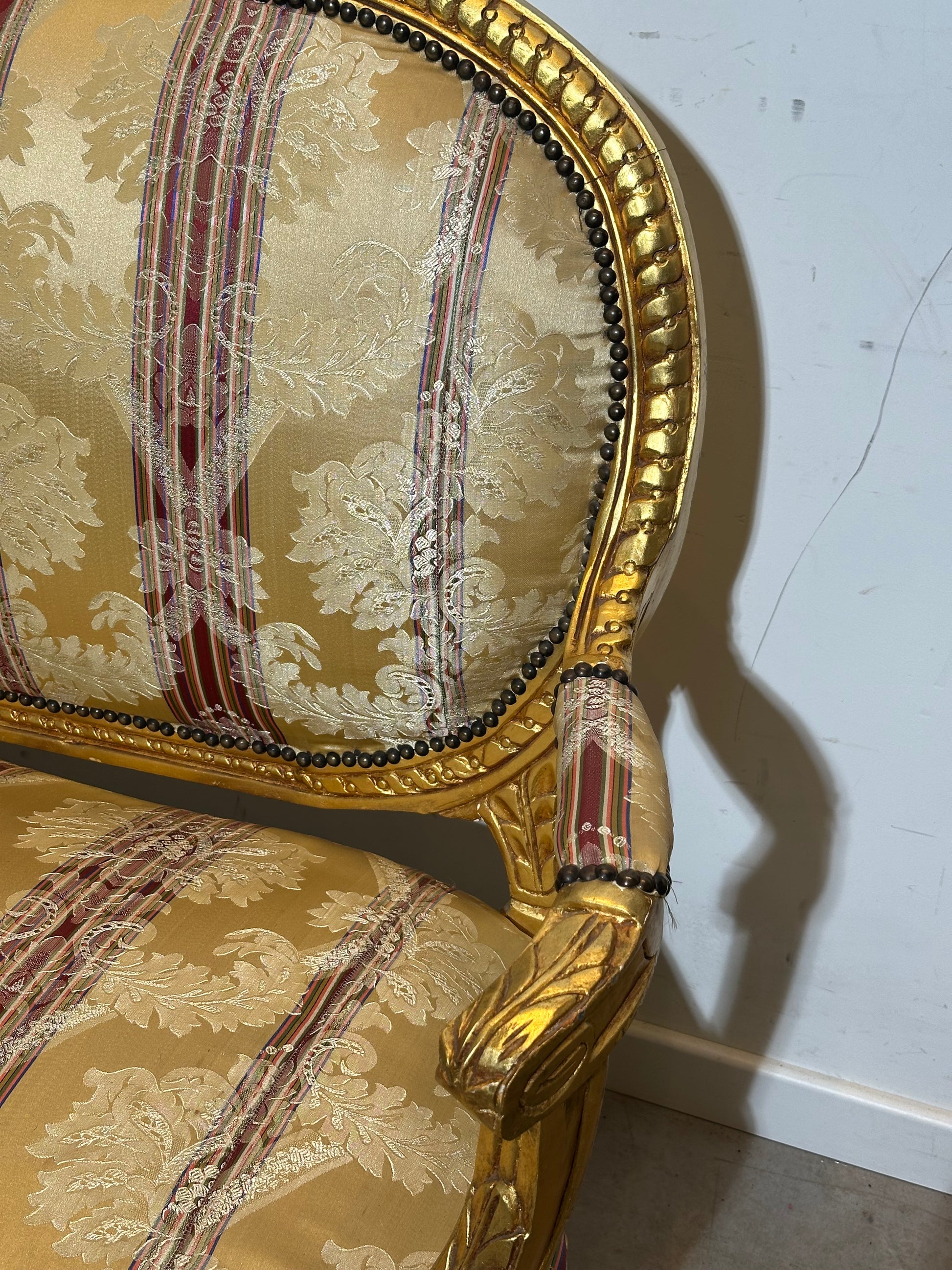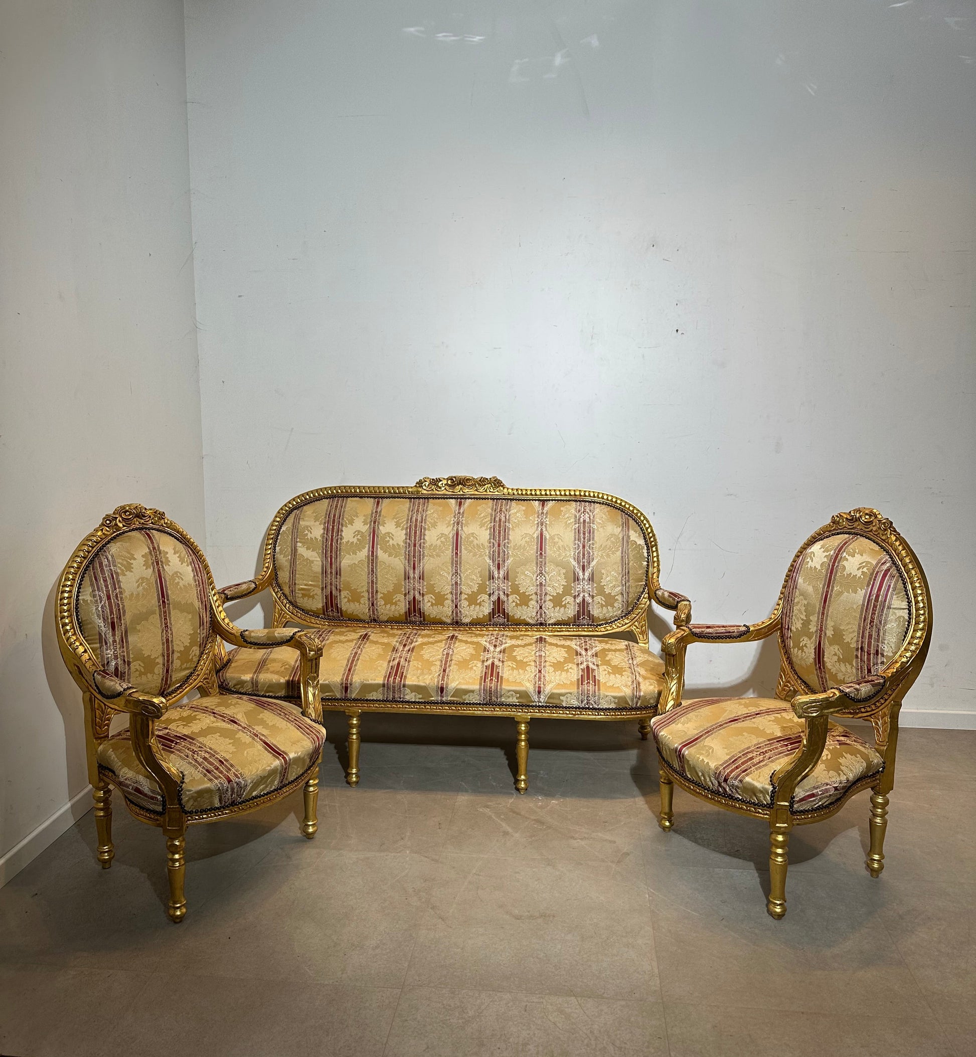This suite features richly carved giltwood frames, classic oval backrests, and original damask upholstery in warm gold and red tones. The ornate craftsmanship and elegant proportions make this the perfect statement set for living rooms, boutique spaces, photo studios, or refined reception areas.
