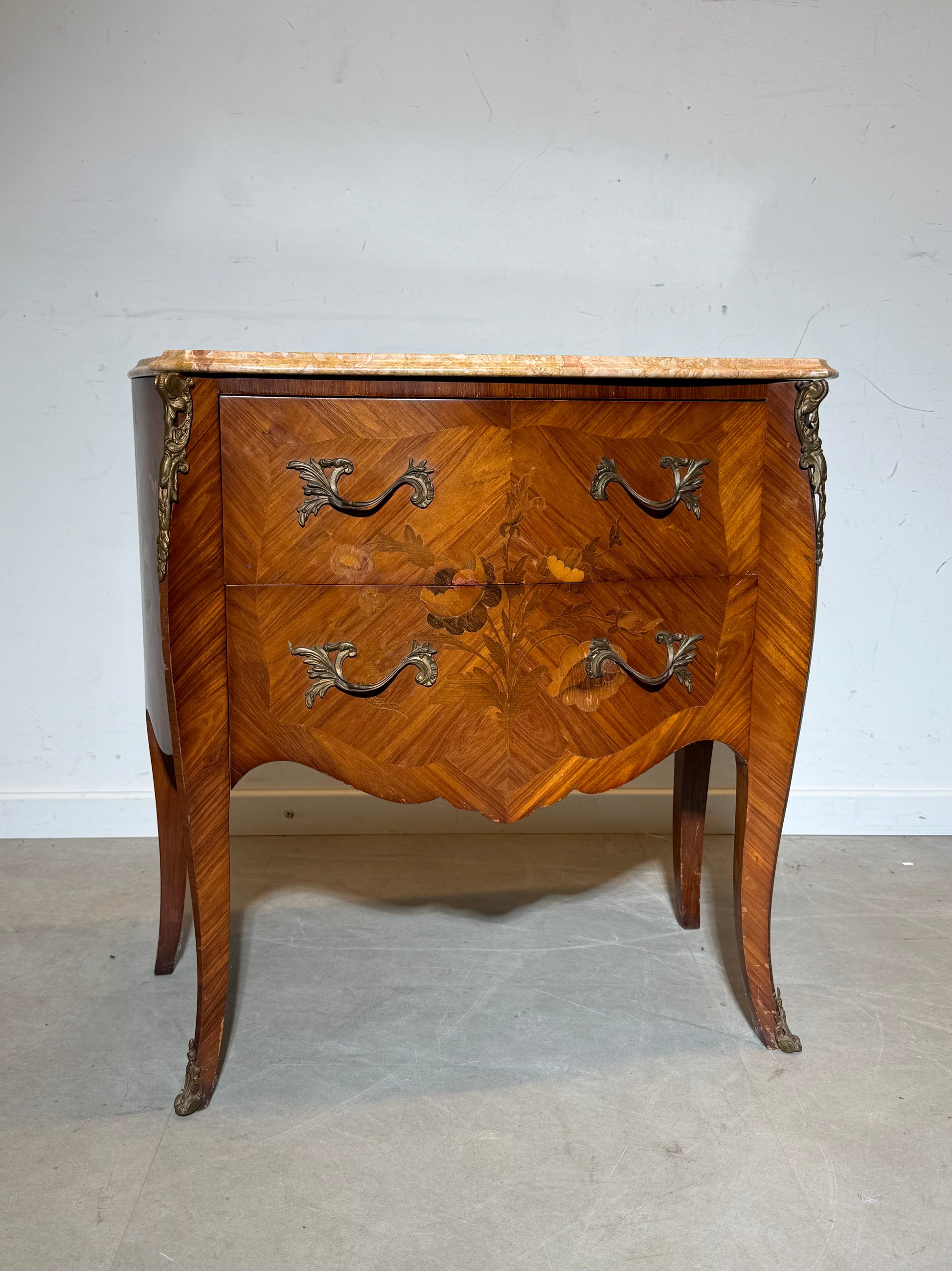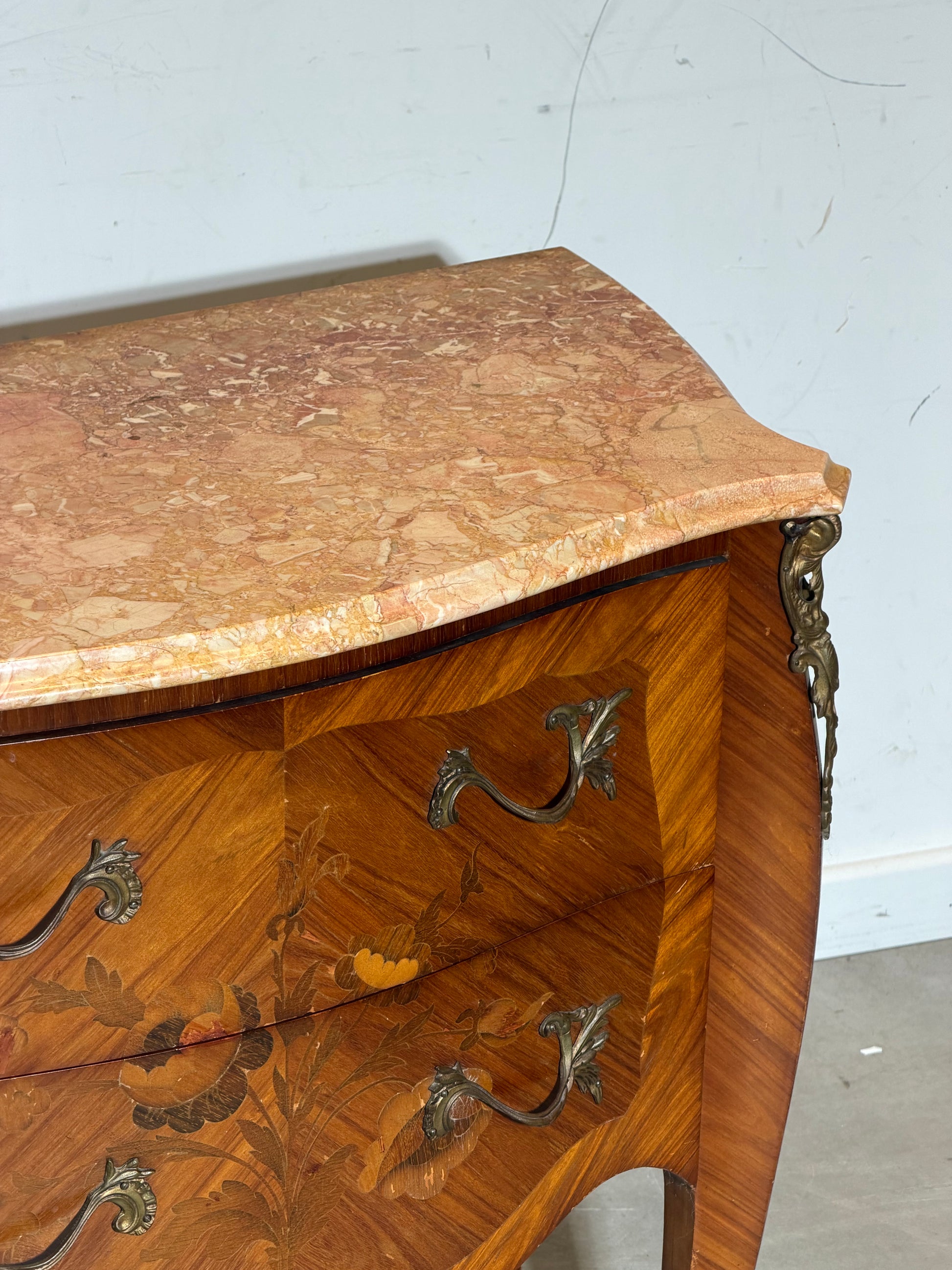 Antique French Marble Top Chest of Drawers – Floral Marquetry