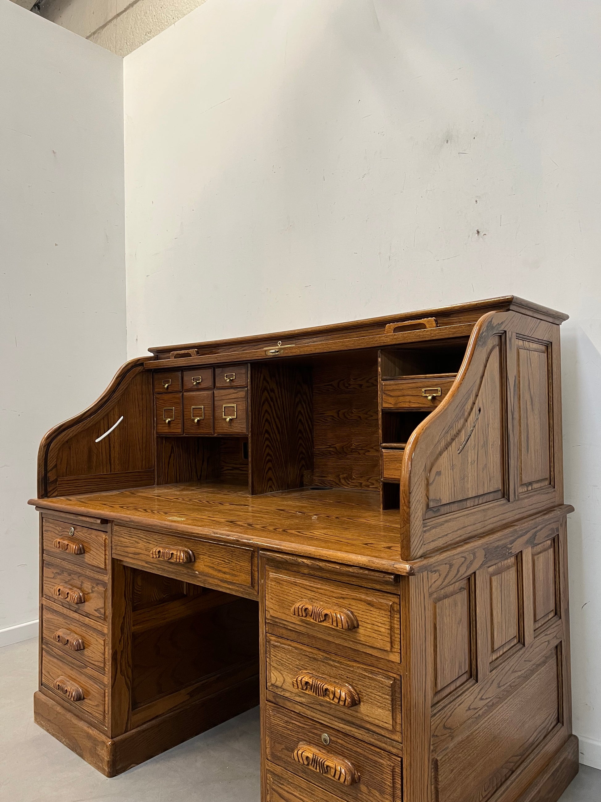 Antique Oak Roll Top Filing Desk with Tambour Shutter – 150 cm
