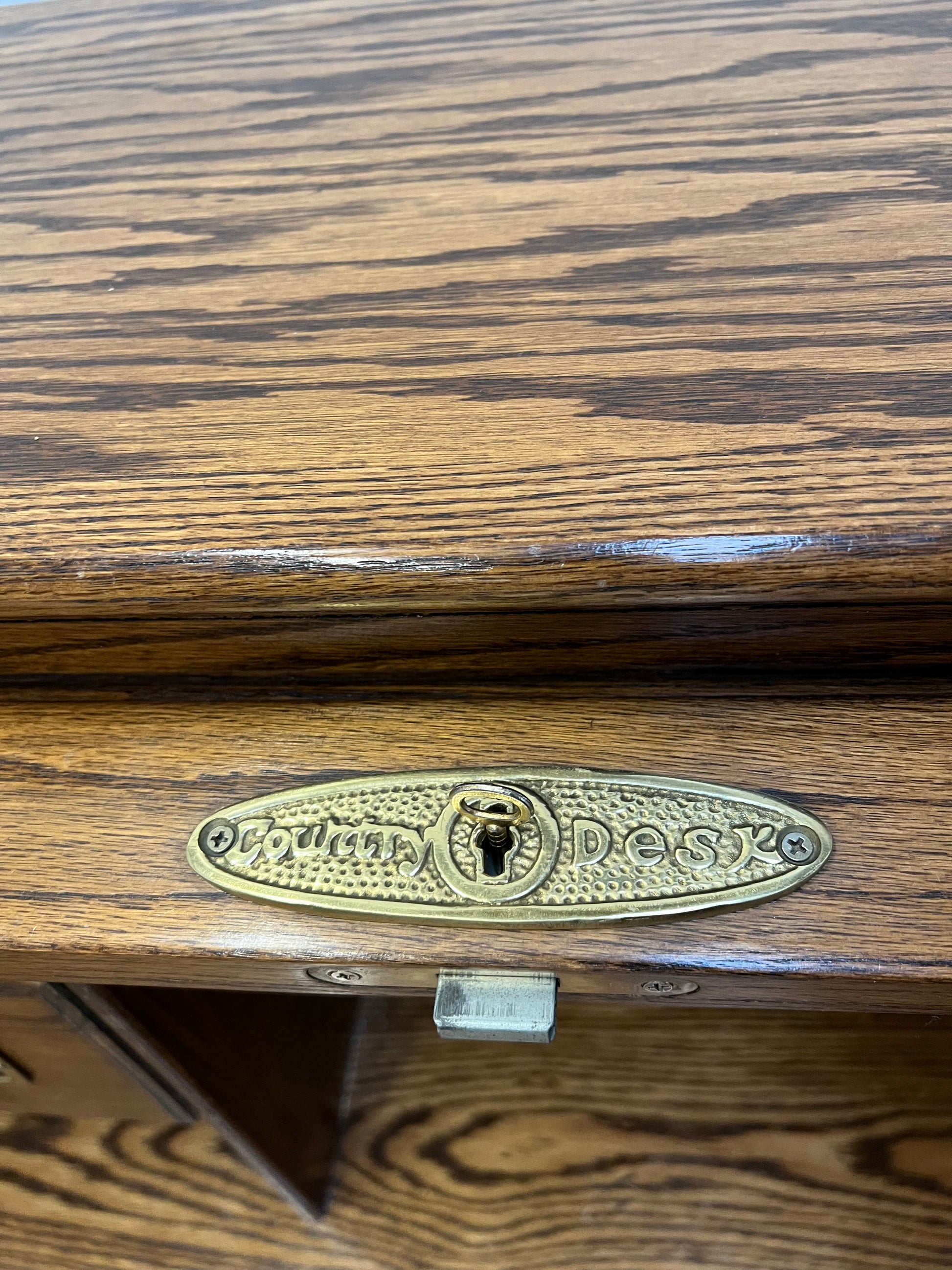 Crafted in solid oak, the desk displays a warm patina and attractive wood grain that adds character and authenticity. The sculpted drawer pulls and curved side panels emphasize the classic craftsmanship typical of early office furniture.
