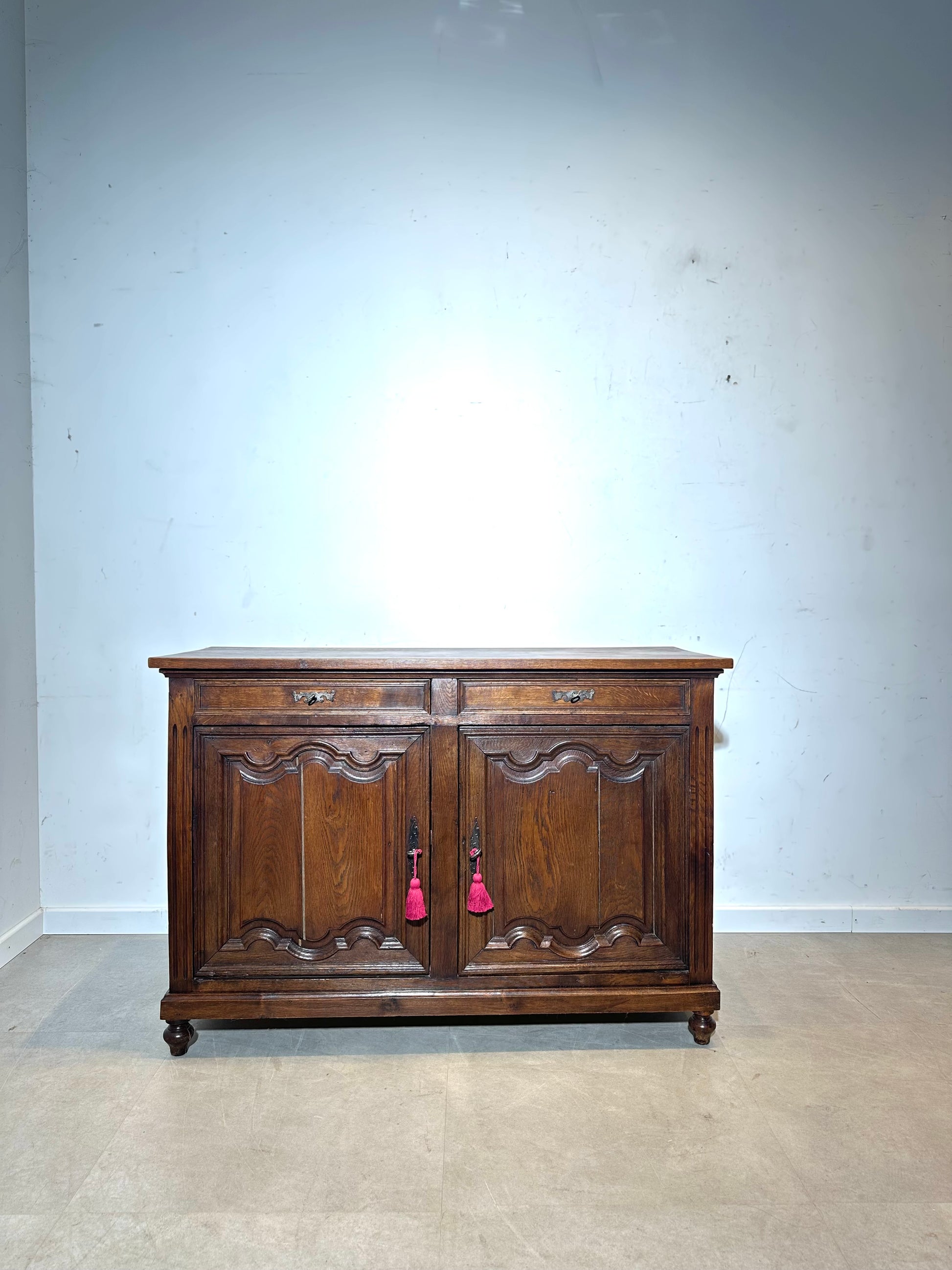 Beautiful antique sideboard in solid oak with warm patina and elegant carved panel details. This classic buffet has 2 top drawers and 2 large cabinet doors offering plenty of storage space. Perfect as a hallway console, dining room storage, or as a statement piece in a vintage interior.