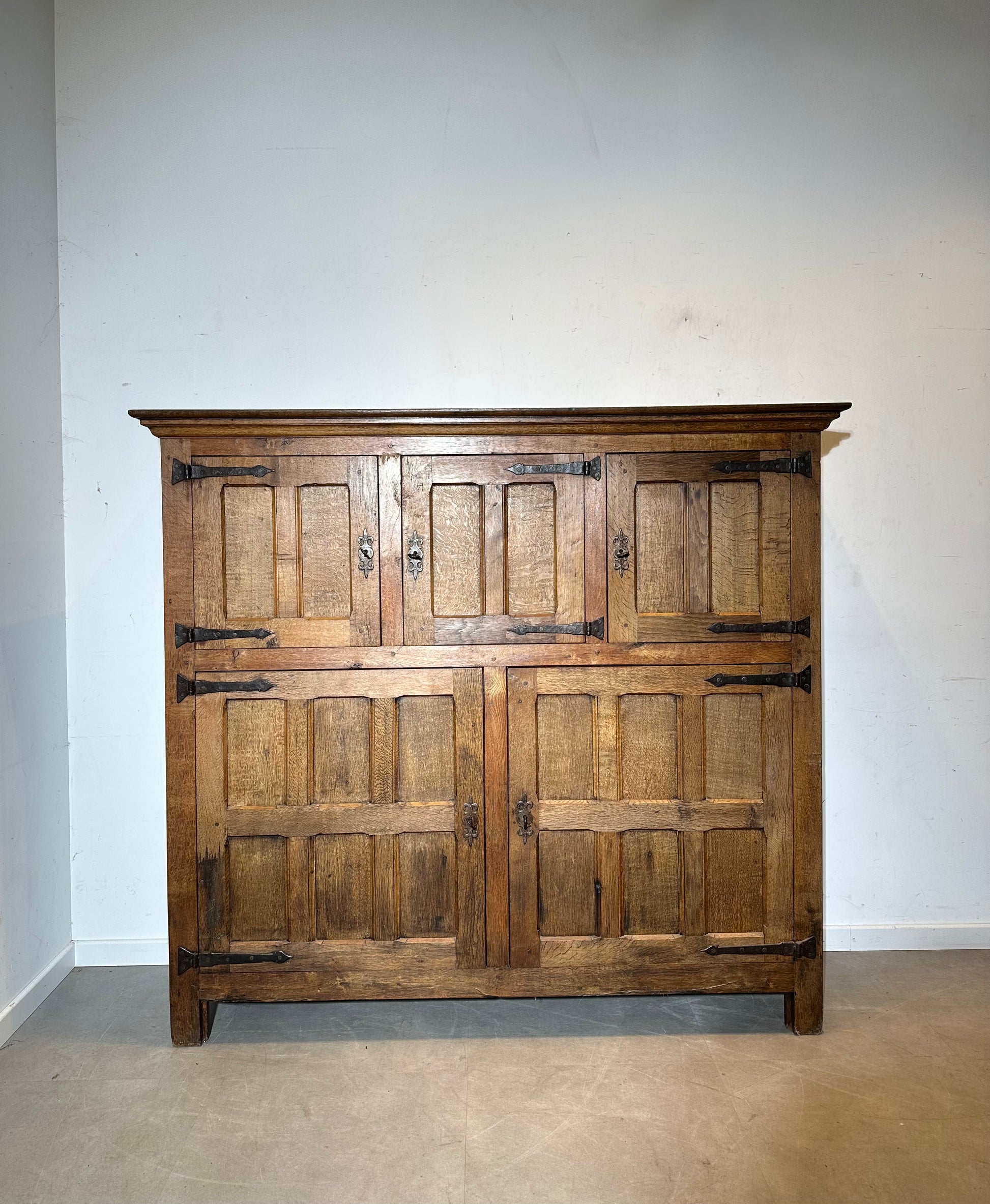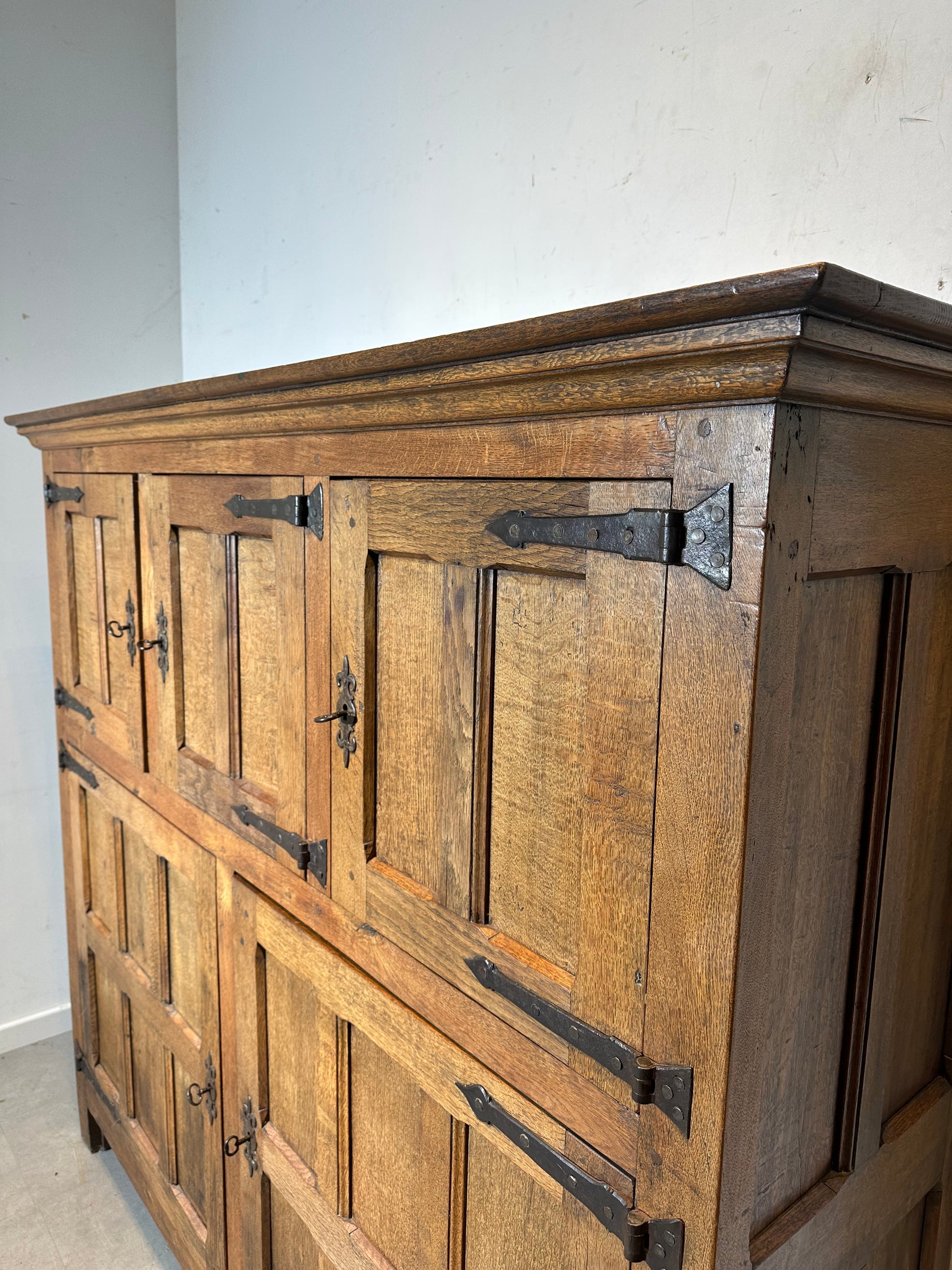 A beautiful antique rustic cabinet crafted from solid oak, featuring stunning aged patina, classic paneled doors and original forged iron strap hinges. This piece has a strong architectural presence and brings instant warmth and character to any interior — perfect for farmhouse, country, wabi-sabi or even modern spaces as a statement storage piece.