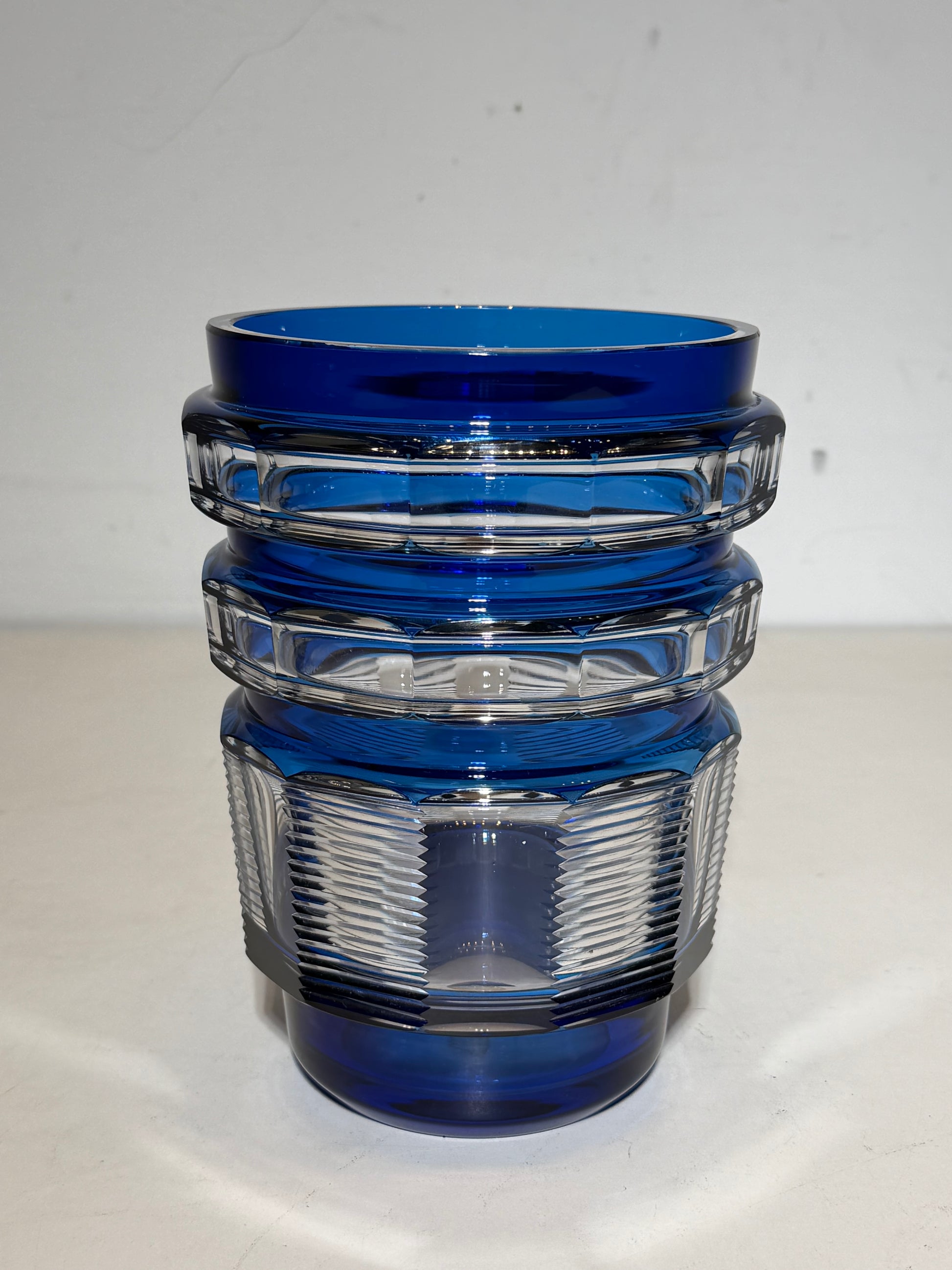 Elegant Belgian crystal vase in a deep cobalt blue, produced by Val Saint Lambert. The design shows strong Art Deco influences with its architectural silhouette, stepped profile, and pronounced cut crystal bands. The ribbed lower section and contrasting clear crystal elements create striking light refraction and a sculptural presence.