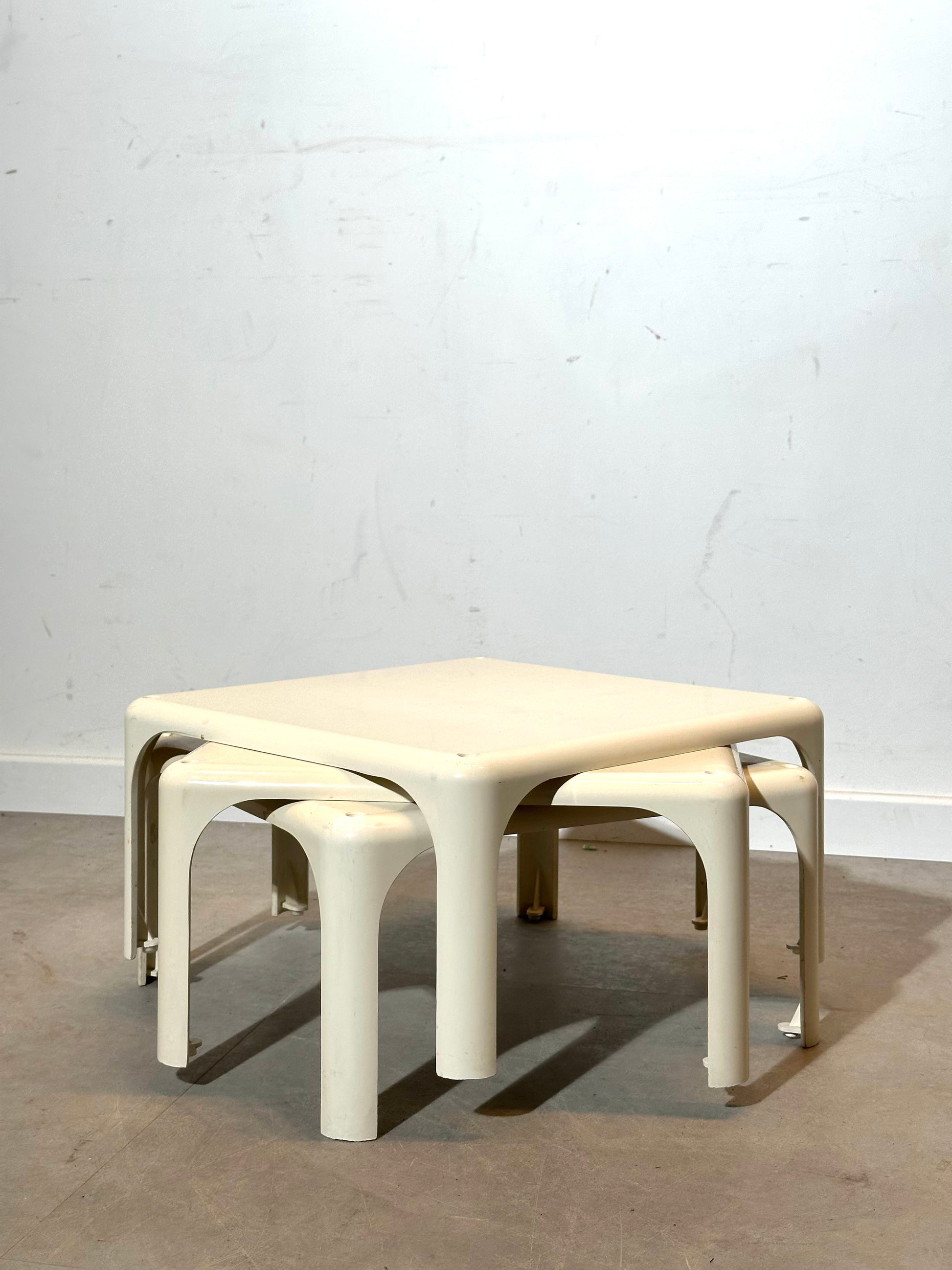 Original Demetrio 45 side table designed by Vico Magistretti for Artemide, an iconic example of Italian radical and functional design from the 1970s. This modular table is made from moulded plastic and was conceived as a versatile, stackable element that can be used individually or combined into shelving or storage systems.