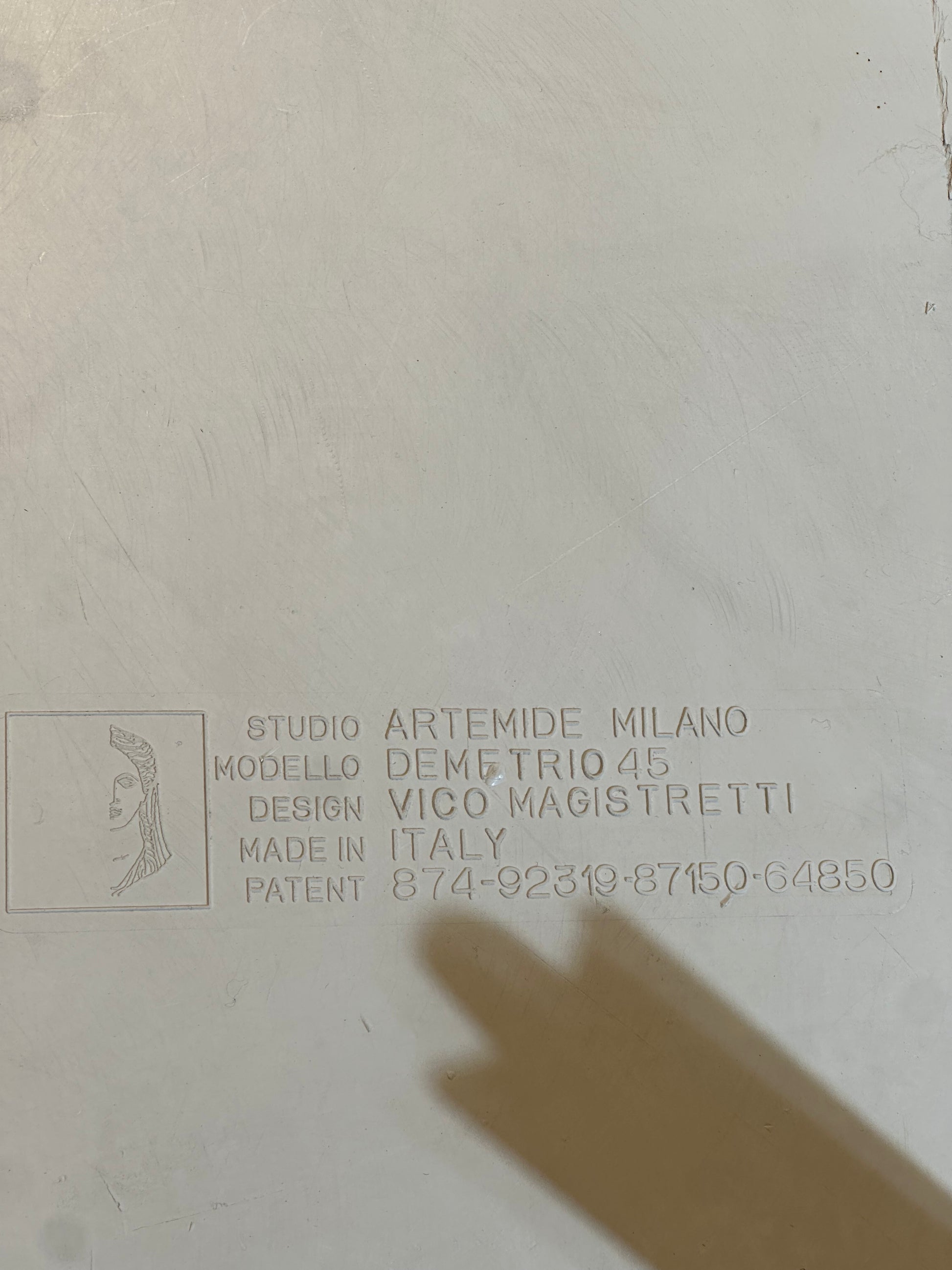 This example is marked underneath with the original Studio Artemide Milano stamp, model Demetrio 45, design Vico Magistretti, made in Italy.