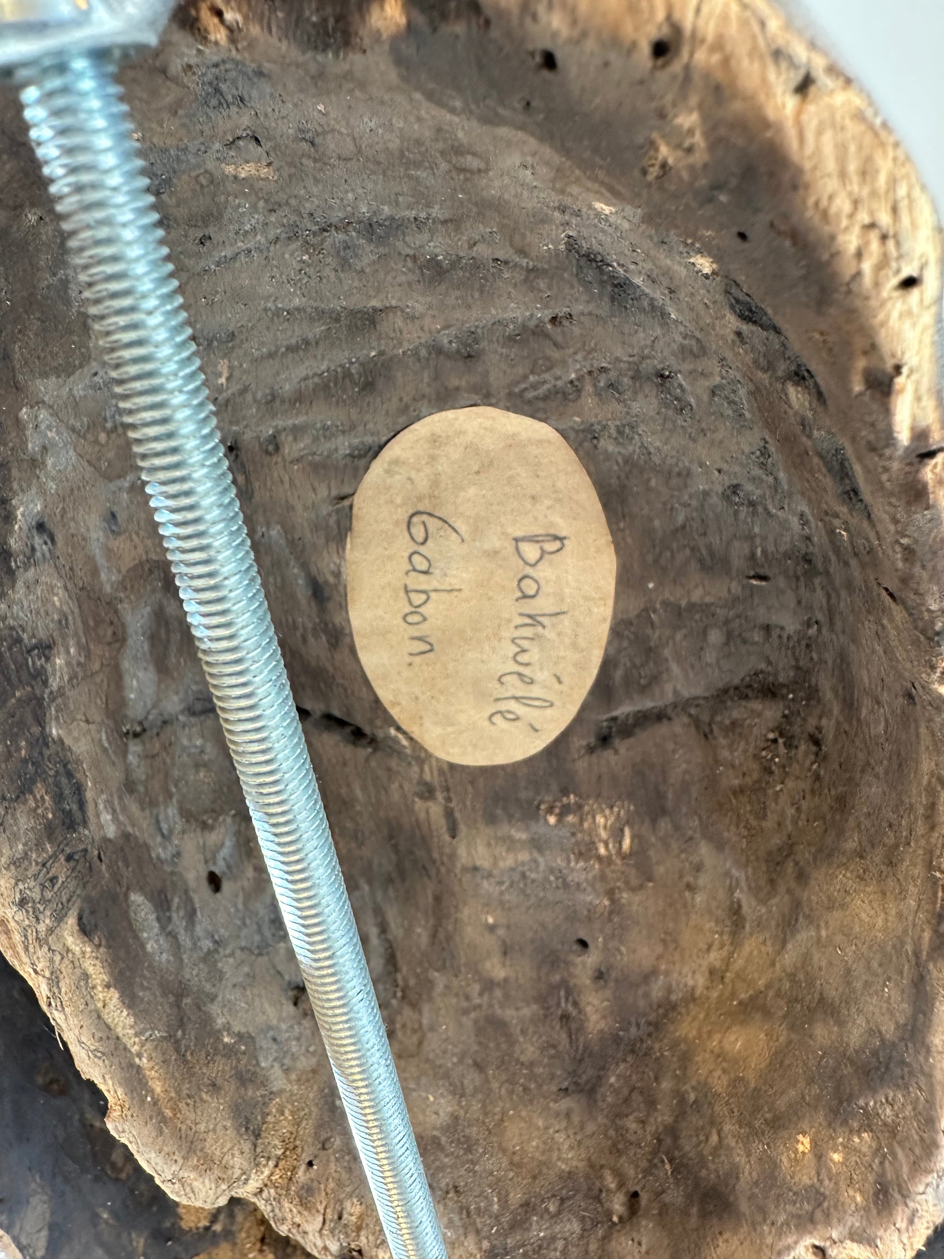 The interior shows clear hand-tool marks and an old handwritten label indicating Bakwele, Gabon, supporting the authenticity of the piece. Mounted on a custom metal stand, the mask is presented as a sculptural object ready for display.