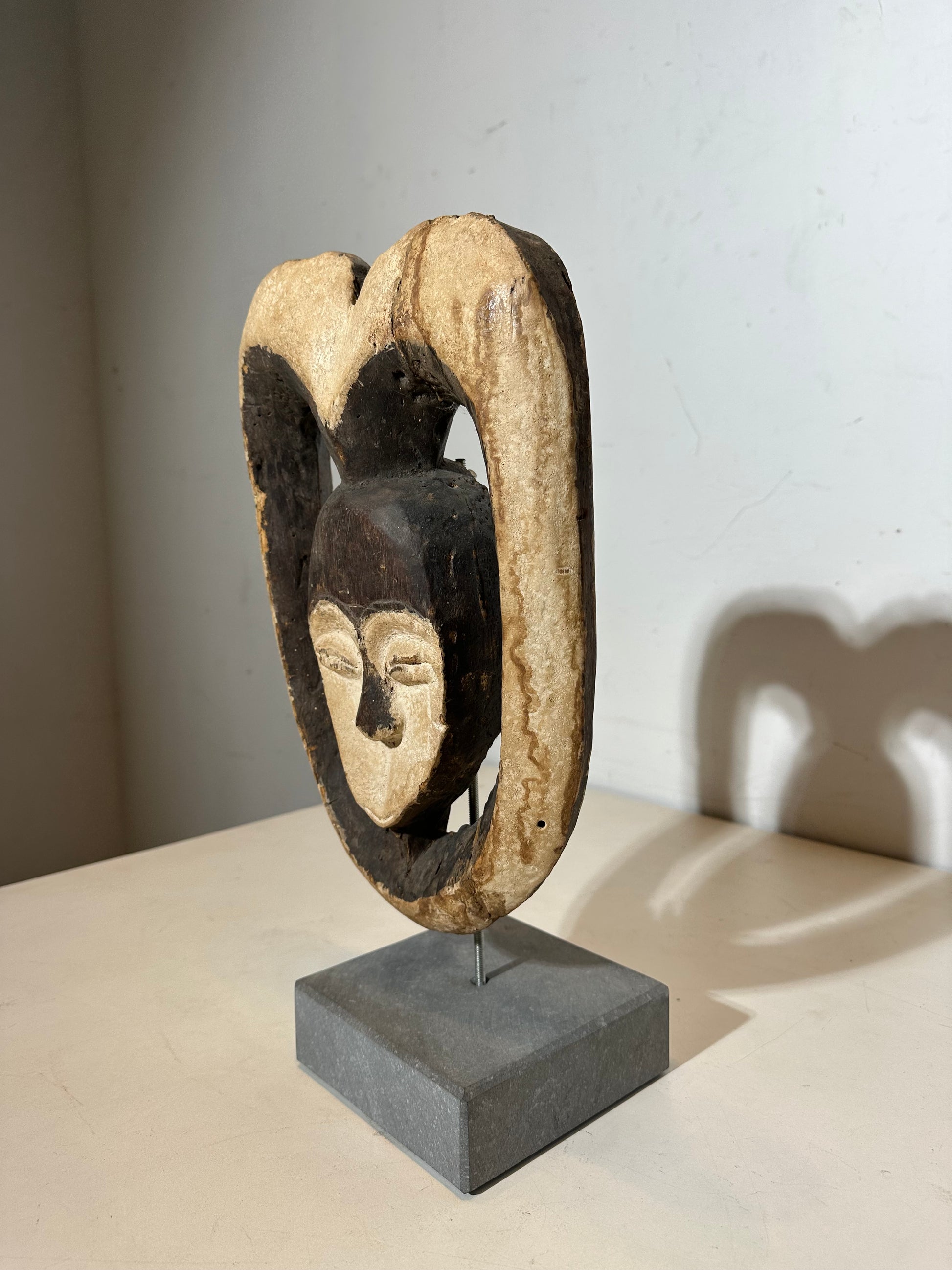 This rare and expressive African ceremonial mask originates from the Bakwele people of Gabon. Carved from solid wood, the mask is distinguished by its striking openwork design: a smaller, serene face framed within a large surrounding structure. This sculptural construction creates a powerful sense of depth and symbolism, characteristic of Bakwele masking traditions.