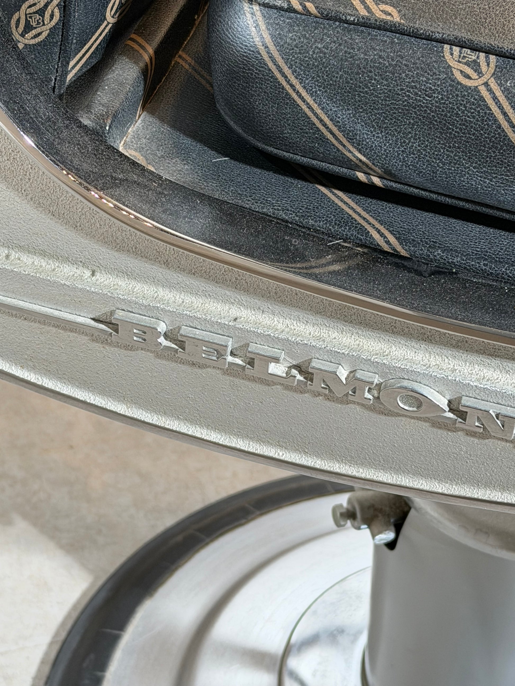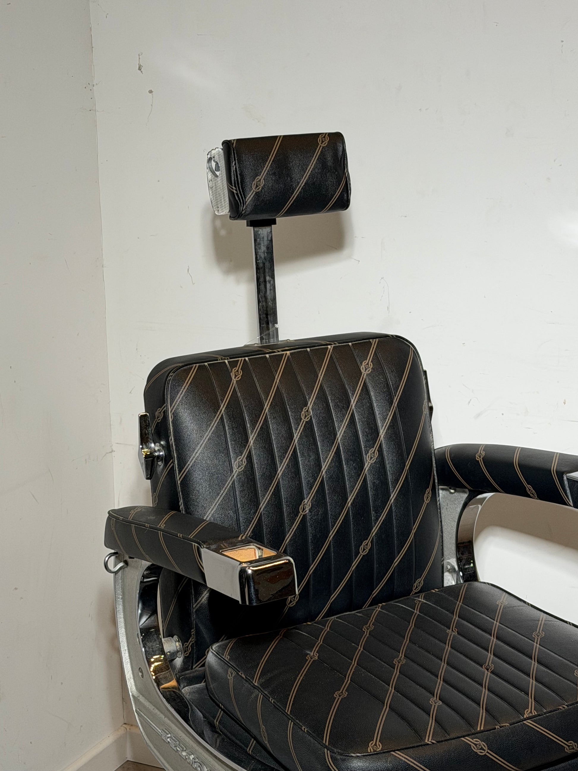 The chair features a heavy cast metal base, adjustable height mechanism, reclining backrest, extendable headrest and integrated footrest. Upholstered in original black upholstery with diagonal stitched pattern, it retains a strong graphic presence while remaining comfortable and functional. The polished metal arm structure and solid engineering reflect the quality and durability for which Belmont is known.