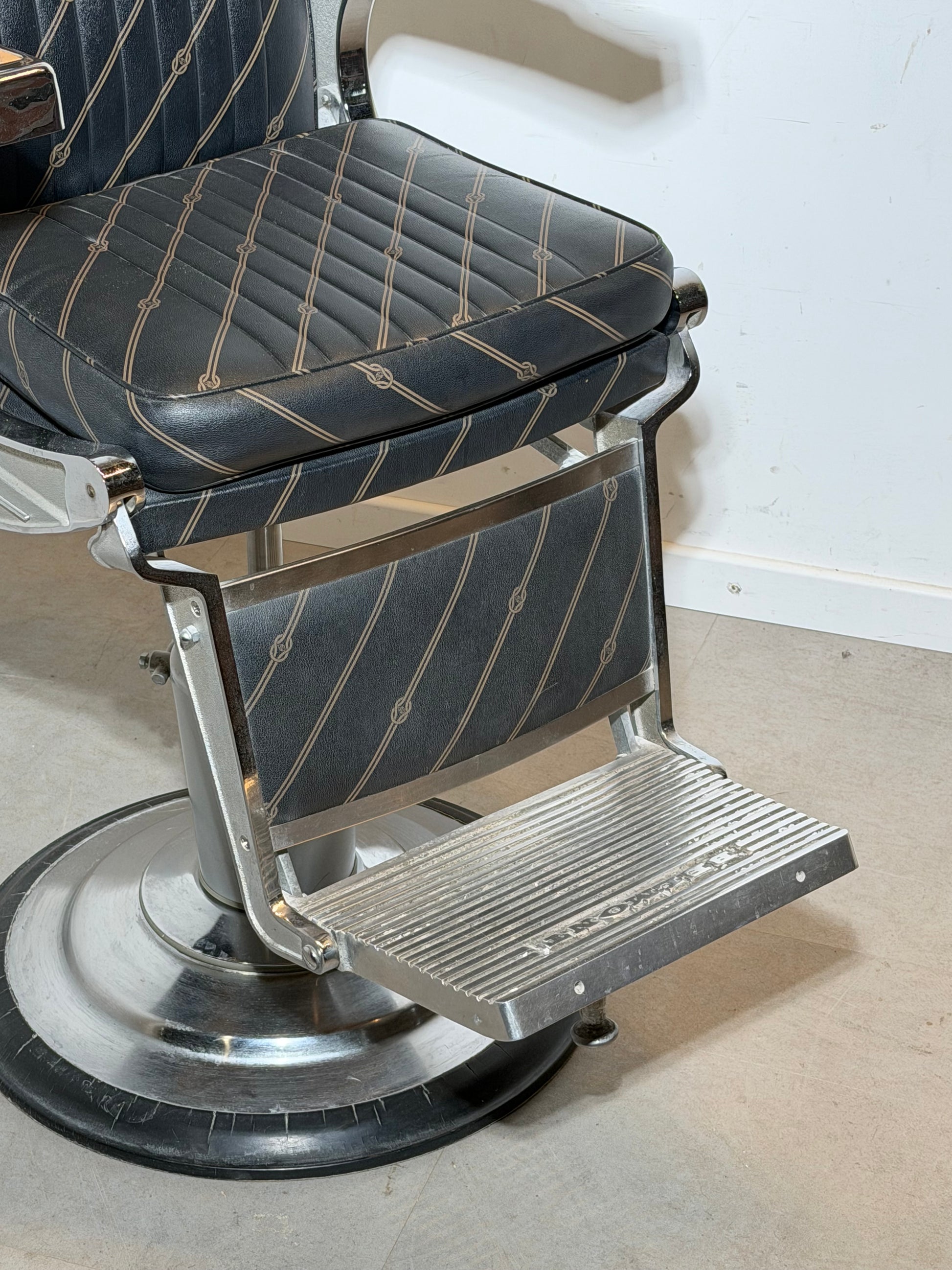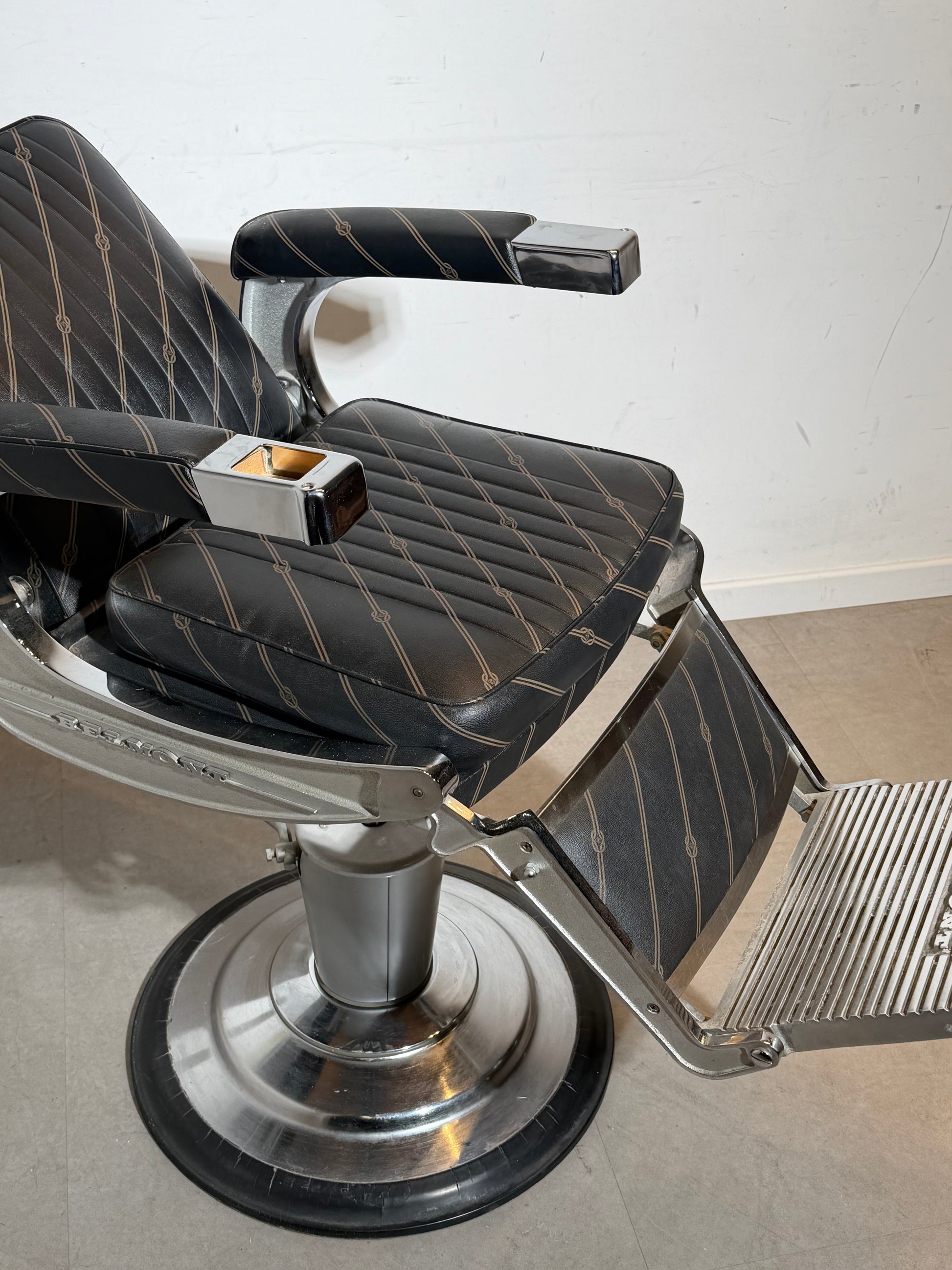 Iconic vintage barber chair, model Apollo II, produced by Belmont, one of the most respected manufacturers of professional barber equipment. This chair is a true design classic, combining industrial strength with refined detailing and excellent ergonomics.