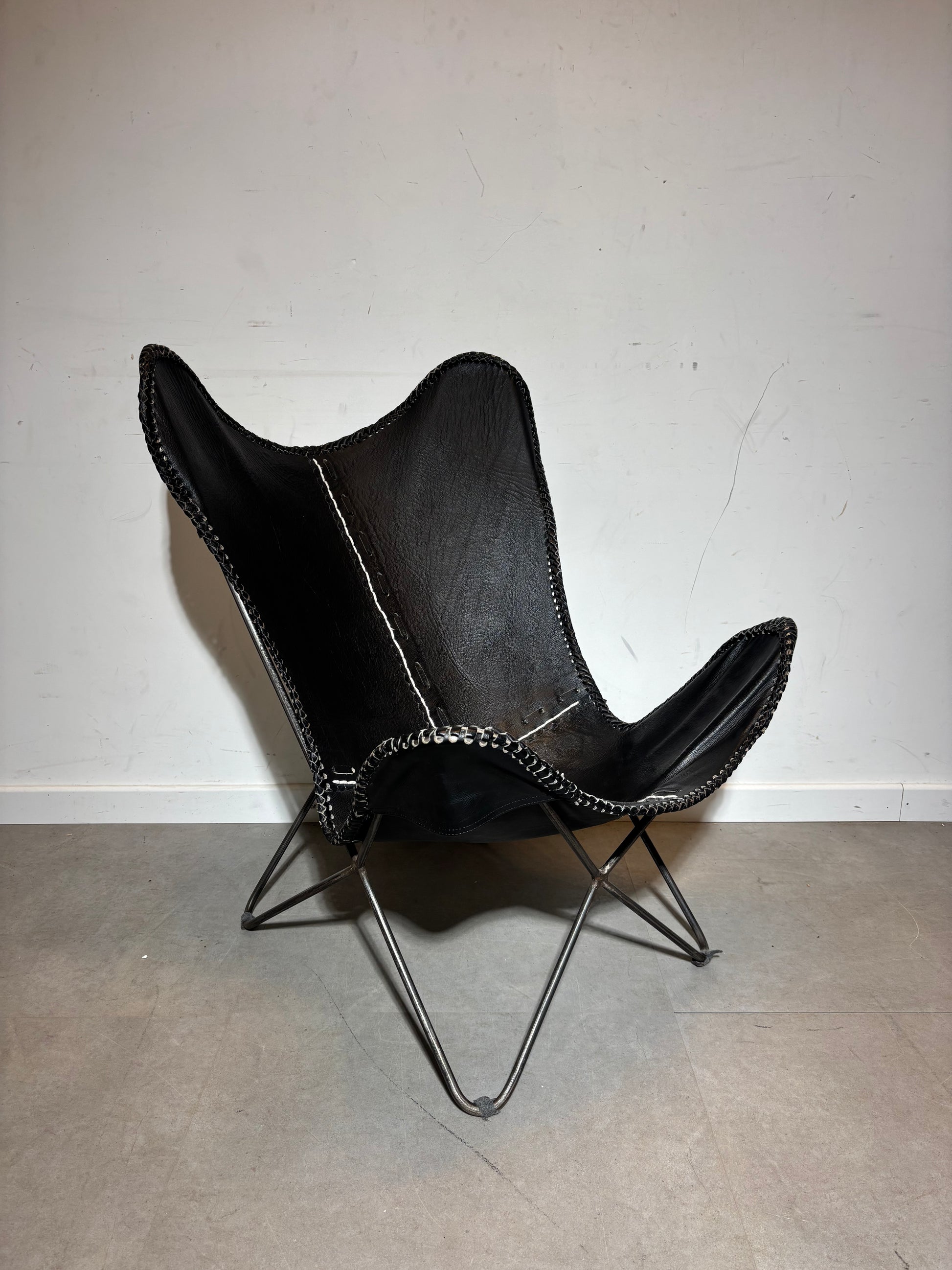 Black leather butterfly chair.