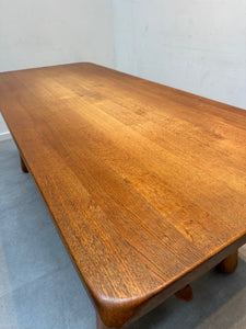 A beautifully crafted mid-century dining table set made entirely from solid oak. This elegant yet robust piece features a thick rectangular tabletop with softly rounded edges, supported by sculptural, hand-shaped legs and a central stretcher for added stability and style.