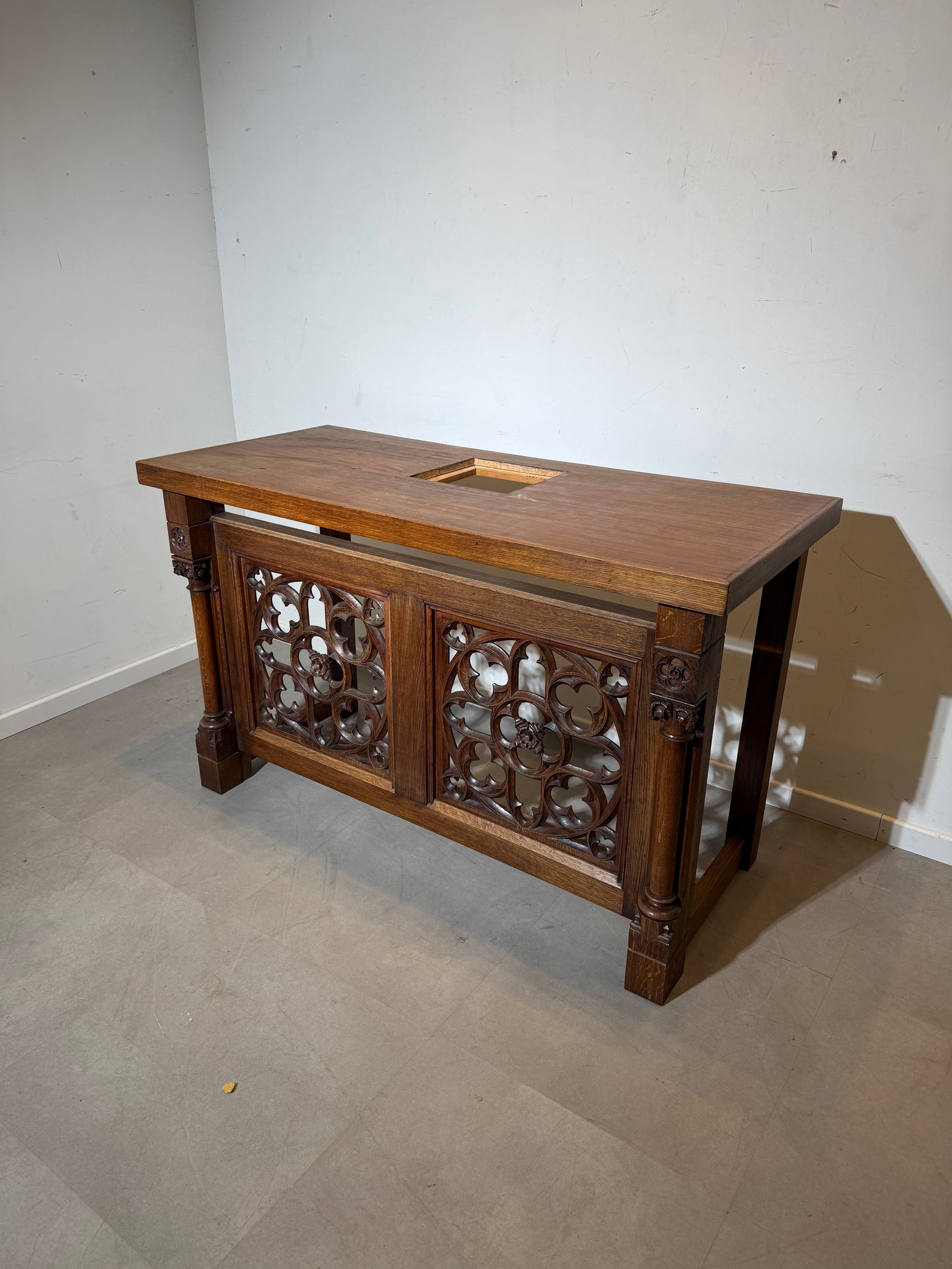 Impressive carved wooden altar or architectural console executed in a Gothic style, featuring richly sculpted tracery panels inspired by medieval church architecture. The front is decorated with openwork quatrefoil and pointed arch motifs, framed by solid carved uprights and resting on robust square legs.