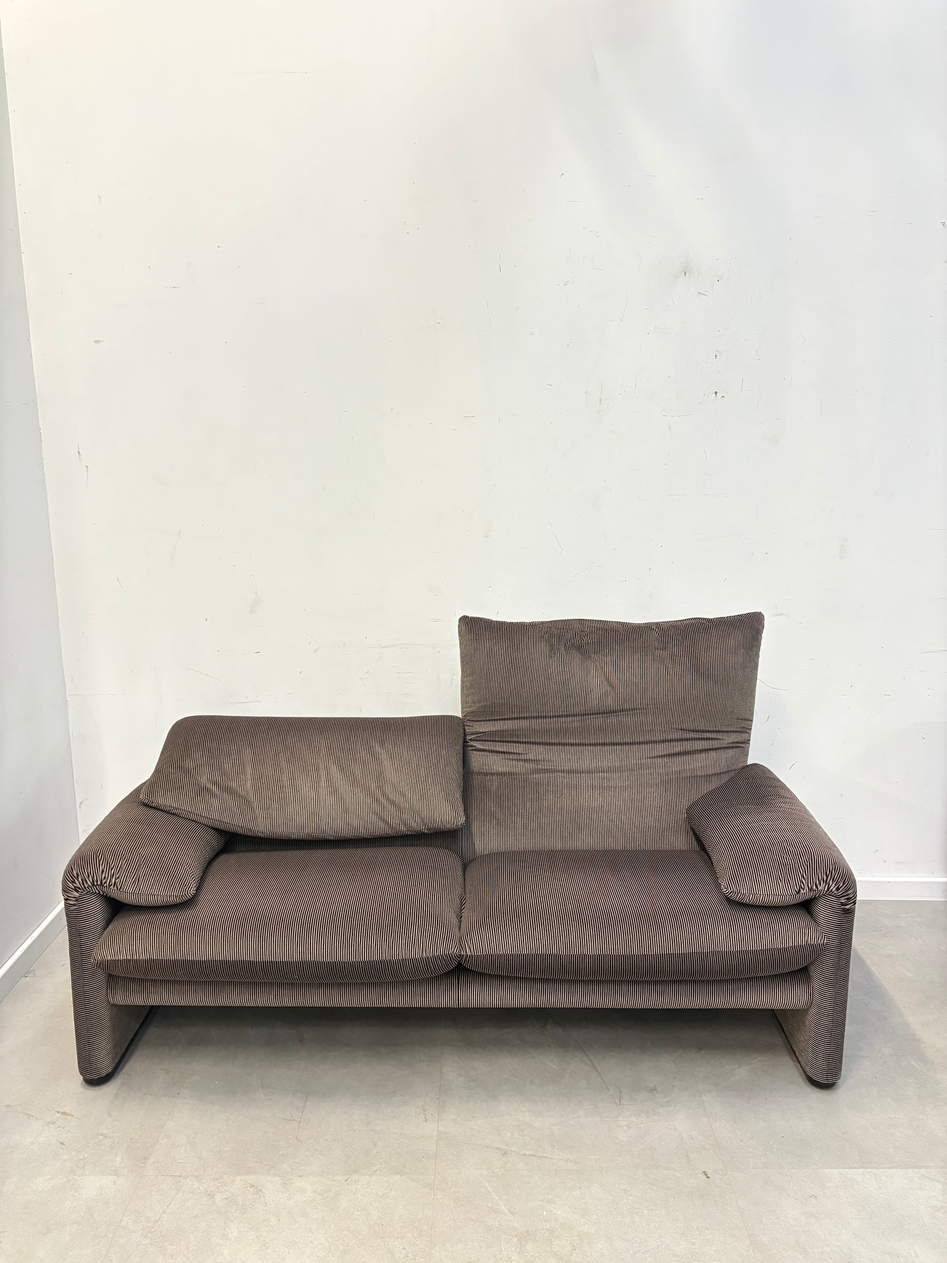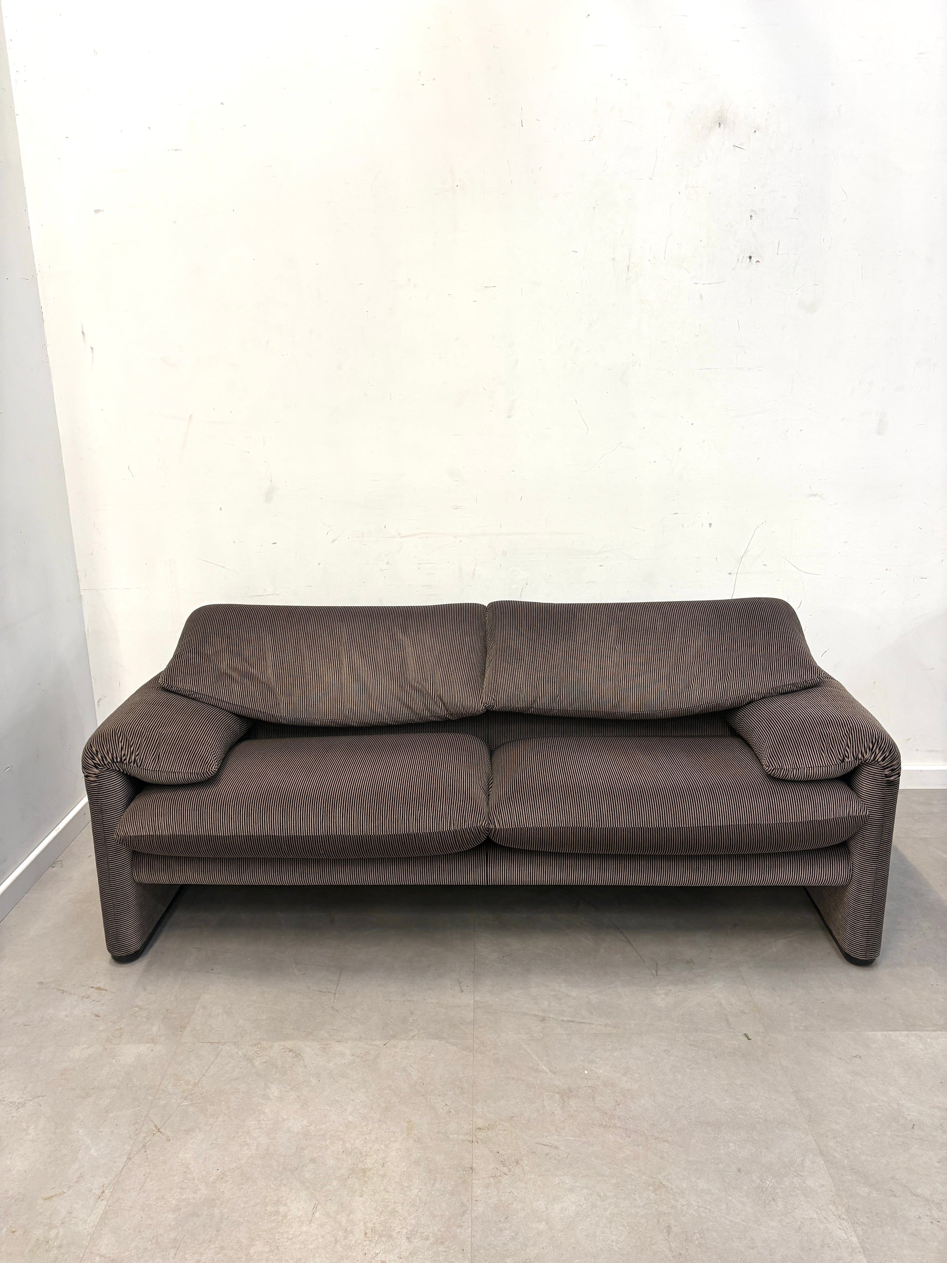 This example features the characteristic generous proportions and sculptural silhouette that made the Maralunga an instant design classic. The sofa is upholstered in a subtle striped fabric, giving it a refined yet relaxed appearance that fits both modern and mid-century inspired interiors.