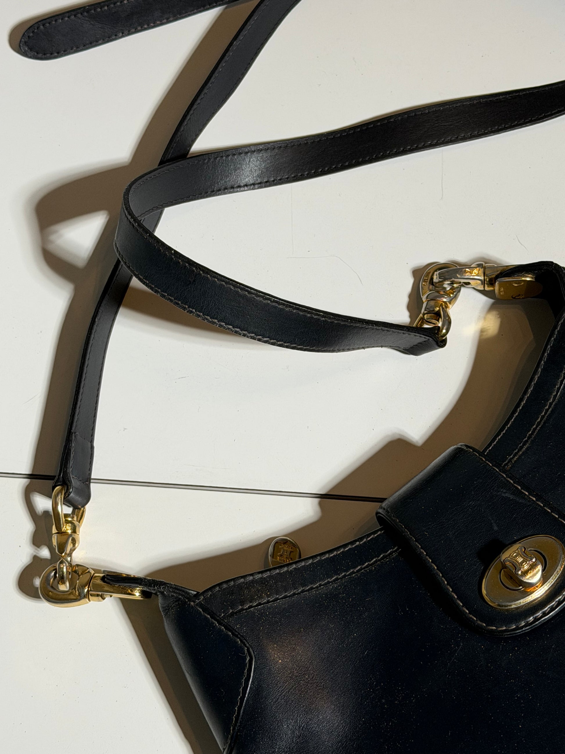 A refined and beautifully preserved vintage Celine Paris crossbody bag in smooth black leather, dating from the 1990s.