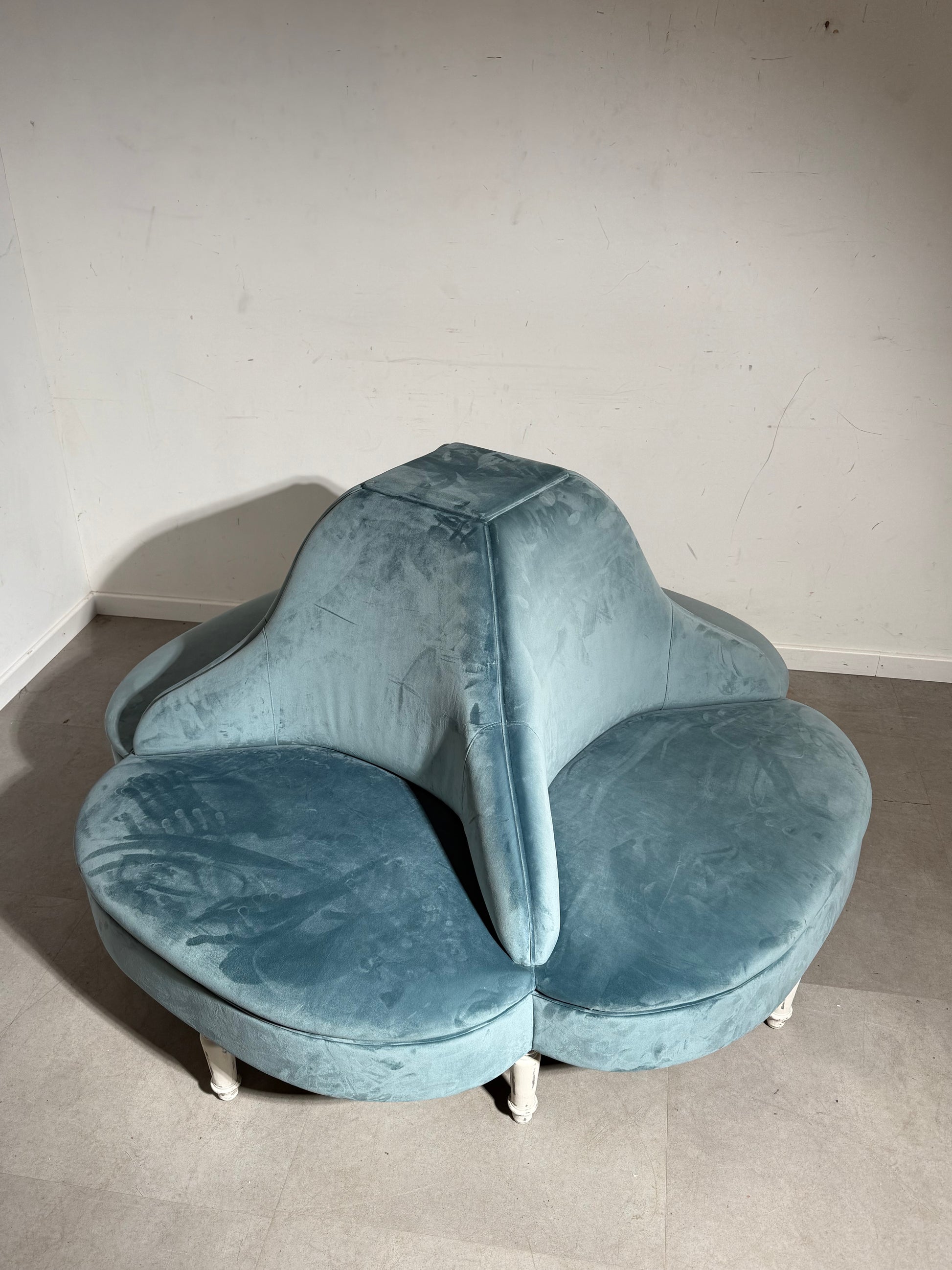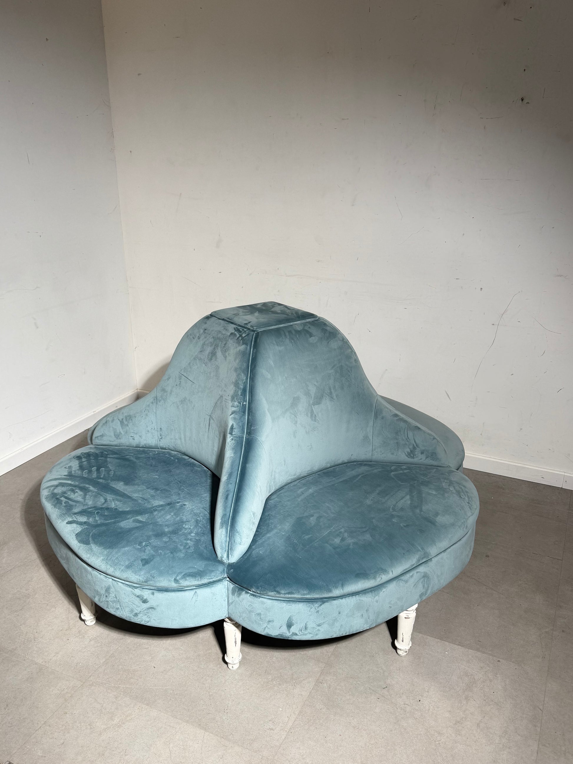 Bring a touch of French boudoir elegance into any interior with this impressive large round conversation seat. Also known as a borne settee, this sculptural piece stands out with its flowing double-sided backrest and luxurious ice-blue velvet upholstery.