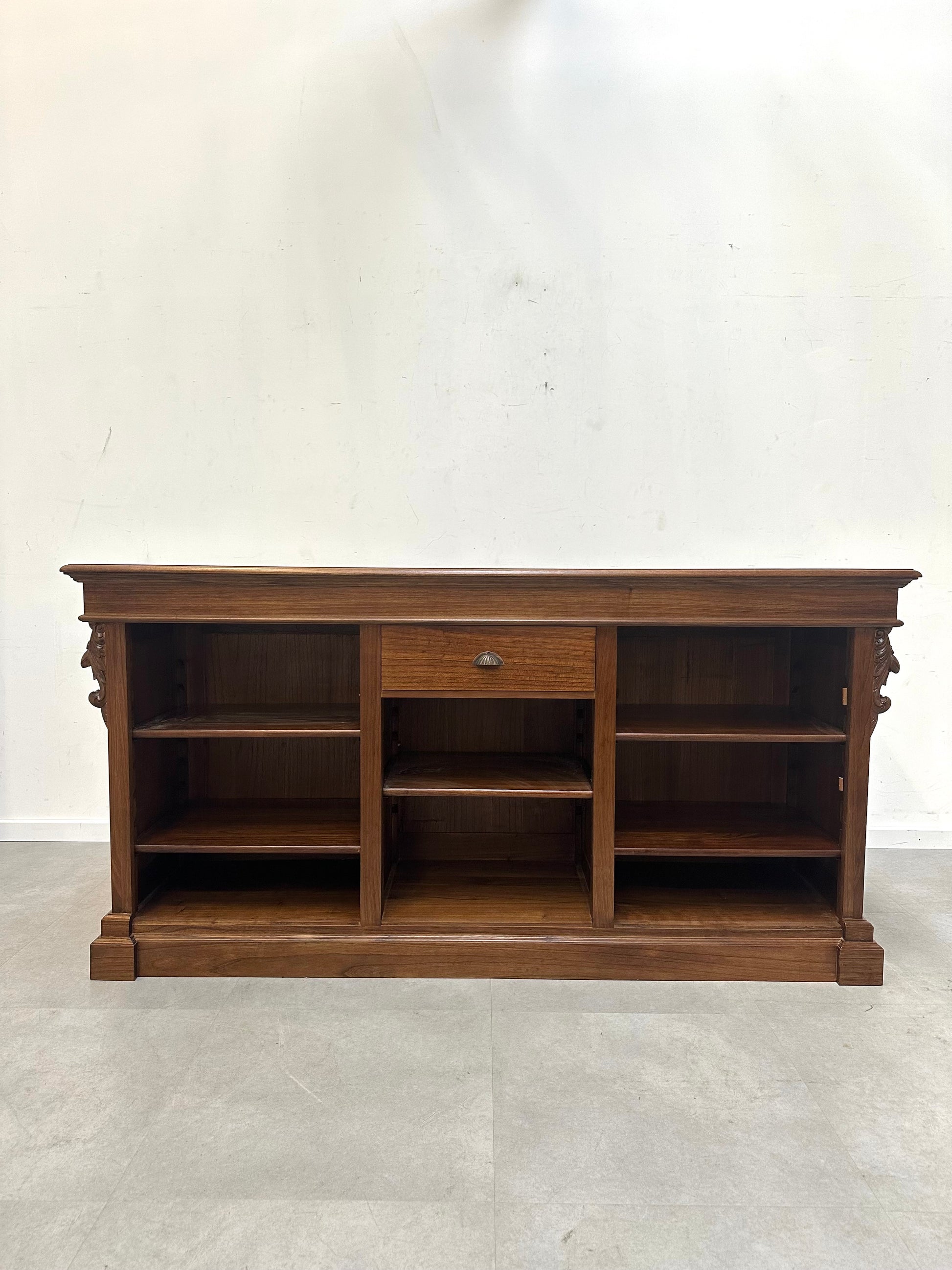 The tall bookcase features finely carved decorative corbels and multiple adjustable shelves, while the counter mirrors the same craftsmanship with panelled fronts and carved detailing. Together, they create a statement piece that combines elegance with functionality.
