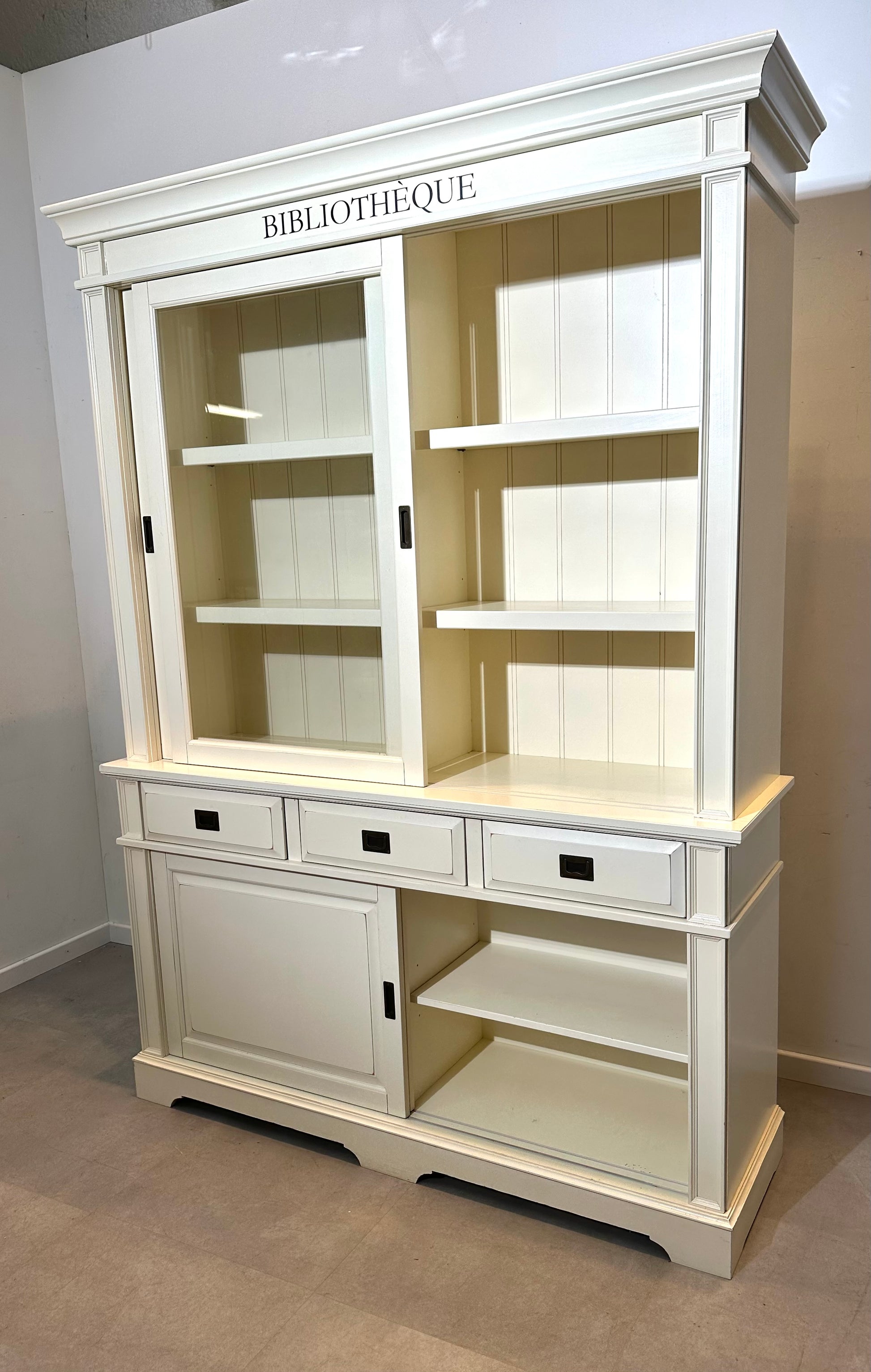 Bring timeless French charm into your home with this elegant bibliothèque cabinet. Finished in a soft cream paint, this large bookcase features the classic “BIBLIOTHÈQUE” inscription on the crown, sliding glass doors with multiple shelves for books or display pieces, and additional storage space below with drawers and sliding panel doors.