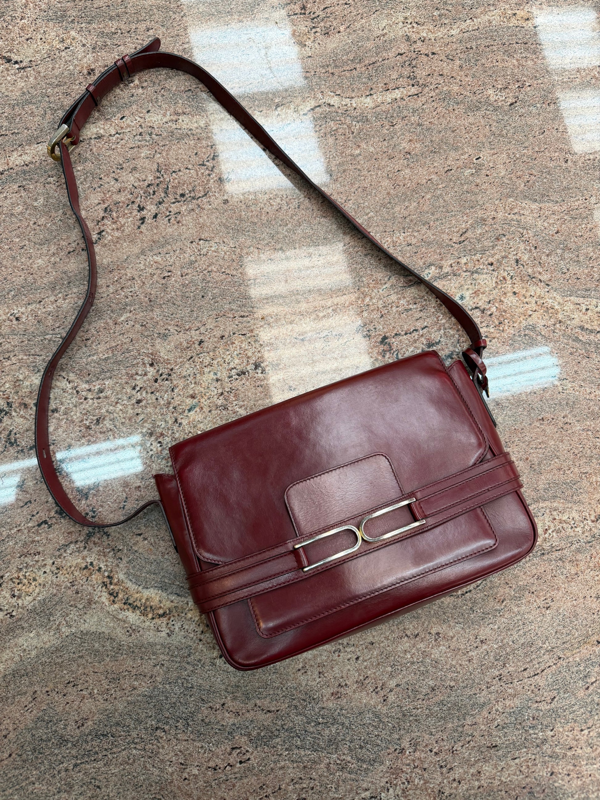 Elegant vintage crossbody bag by the Belgian luxury house Delvaux, crafted in beautiful burgundy (bourgogne) leather. This timeless design features a structured rectangular silhouette with the iconic metal hardware detail on the front strap, giving the bag a refined and recognizable Delvaux character.