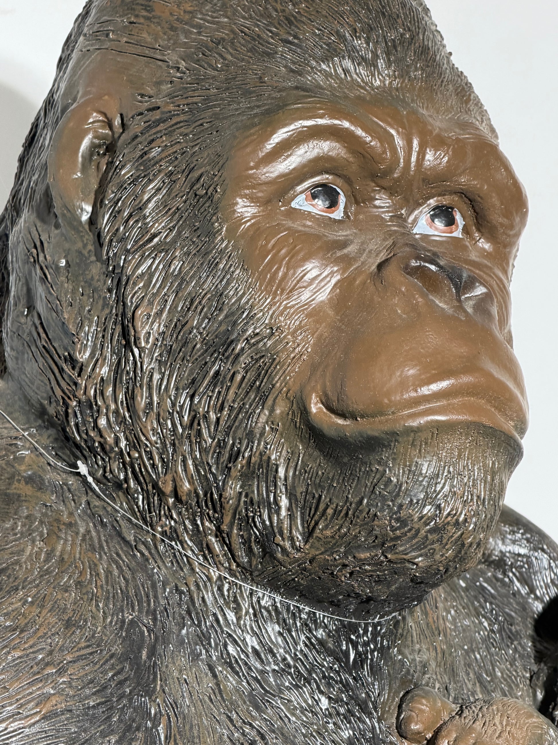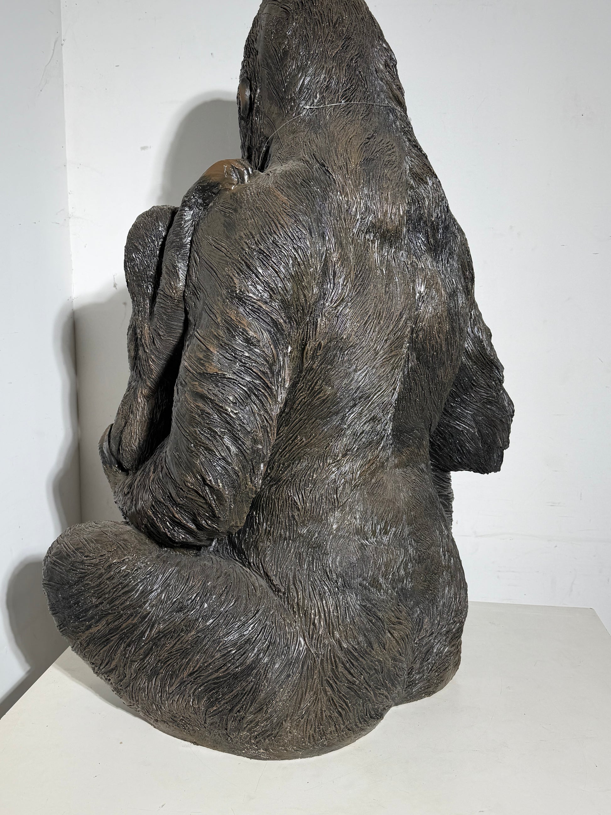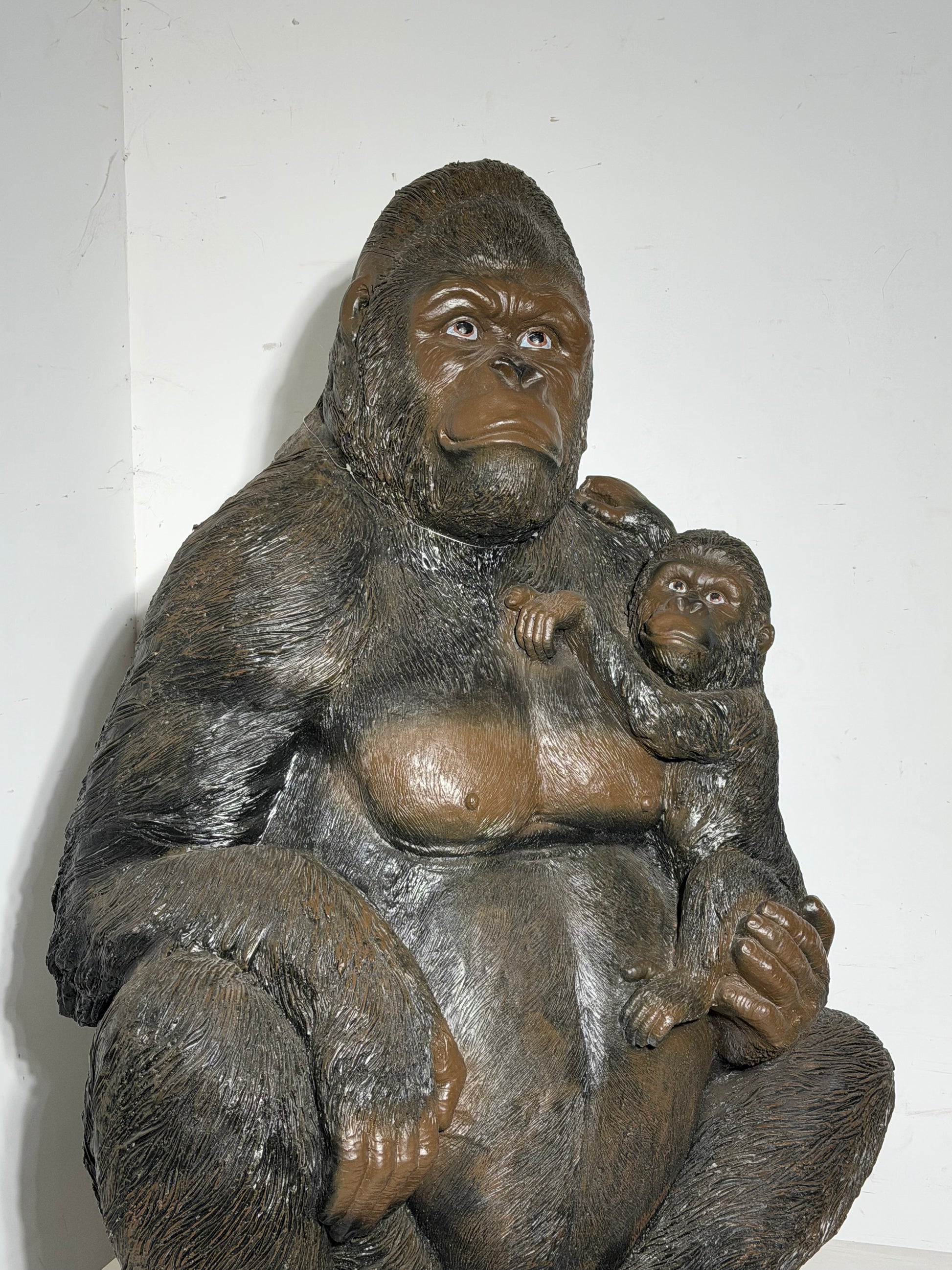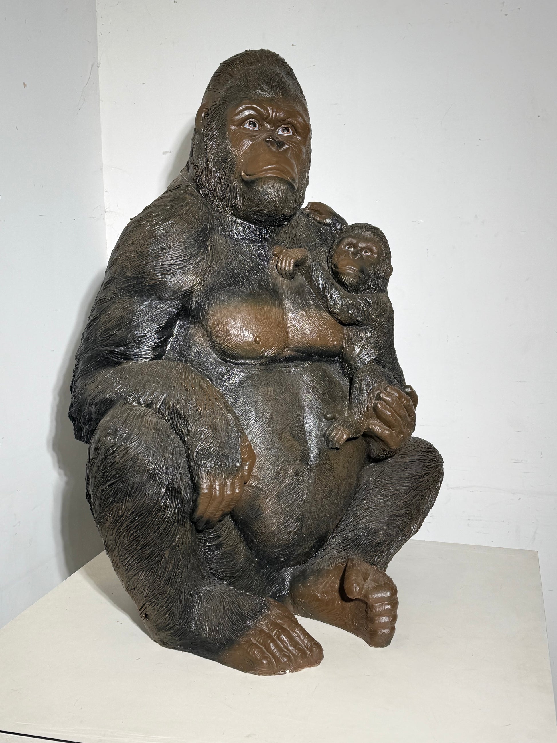 Impressive large decorative sculpture depicting a seated gorilla holding its baby. This powerful and emotional piece combines realism with strong presence, making it a true statement object for interior decoration, shop displays, offices, or eclectic living spaces.