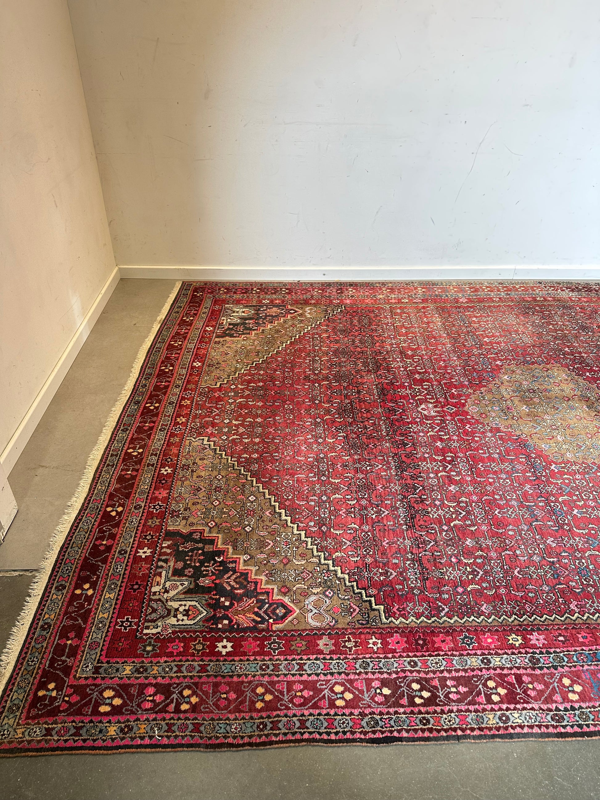 Good vintage condition with normal signs of age and use. Light wear consistent with an authentic hand-knotted carpet. Fringe and edges present. See photos for details.