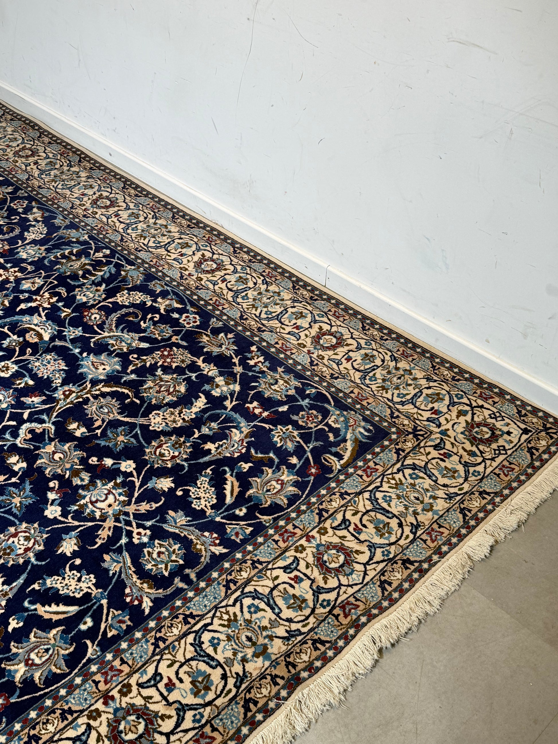 Elegant hand-knotted Persian Nain rug featuring a deep navy blue field with intricate floral arabesque motifs and a refined ivory border. This classic design is known for its high level of detail and balanced composition, making it a timeless piece for both traditional and contemporary interiors.