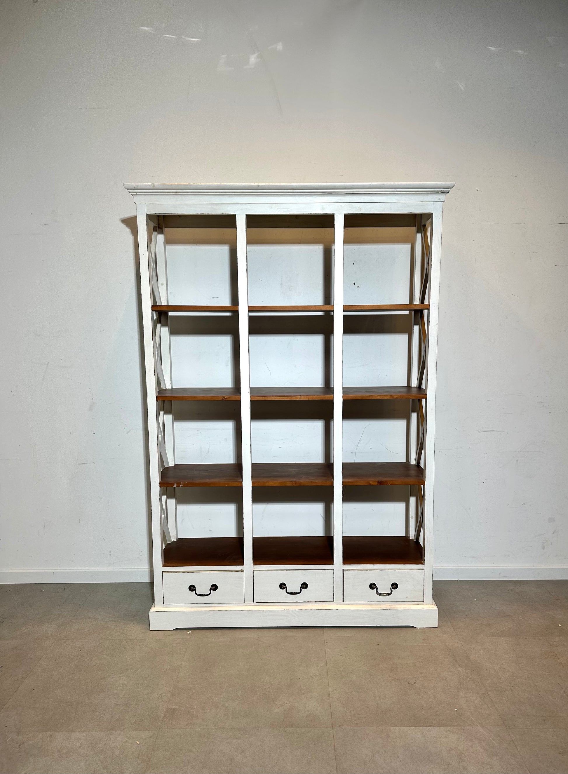 Elegant open bookshelf featuring a white painted frame with natural wood shelves and three lower drawers. The side cross design adds a decorative touch, while the contrasting wood tones give it a warm, rustic charm. Perfect for displaying books, ceramics, or decor in a country-style or coastal interior.