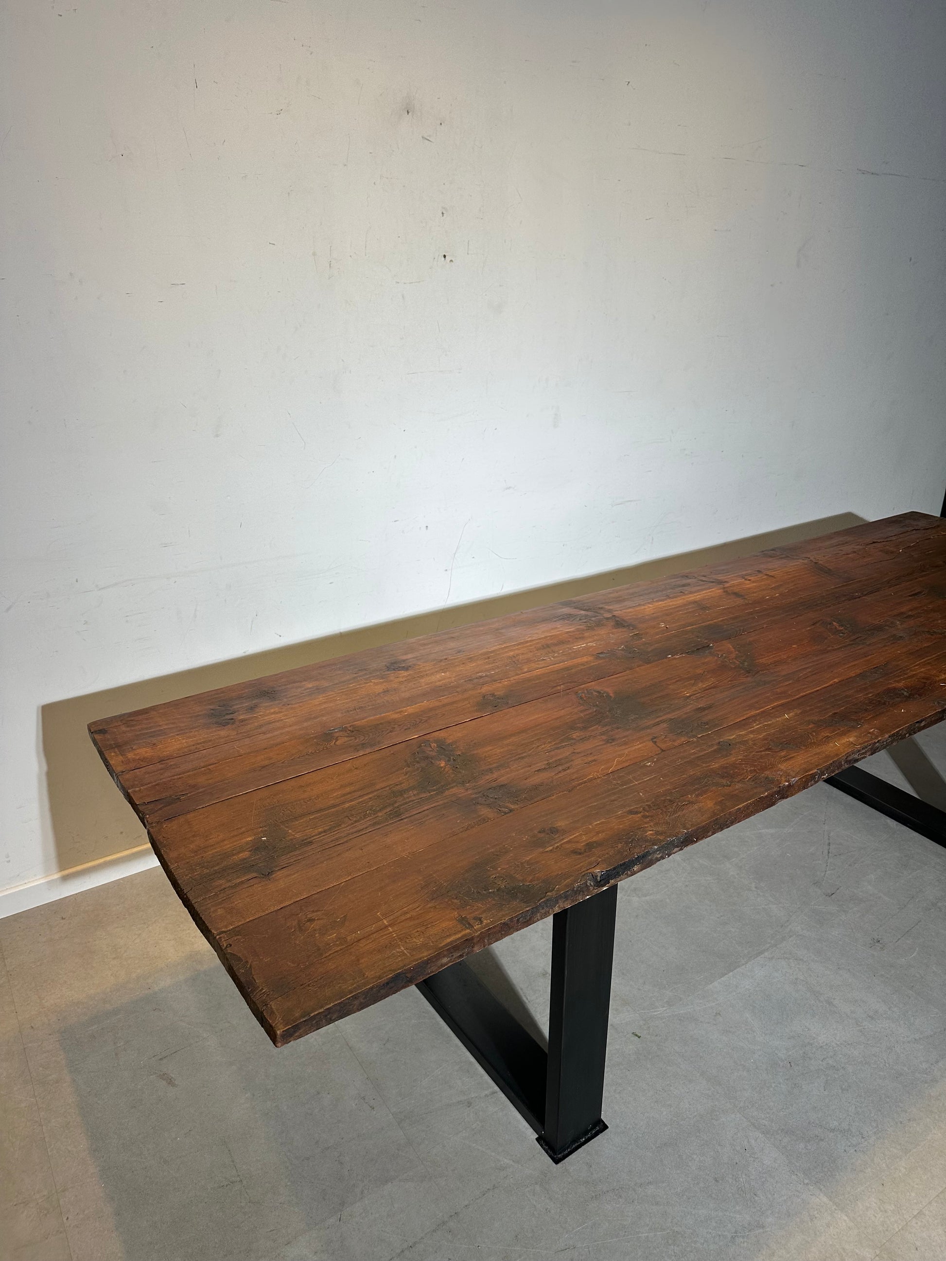 A beautiful extra-long bench made from solid Lariks (larch) wood, featuring a rich aged patina, visible grain and natural imperfections that give it a warm rustic character. The thick wooden top is paired with sturdy black metal legs, creating a perfect balance between natural charm and industrial design.