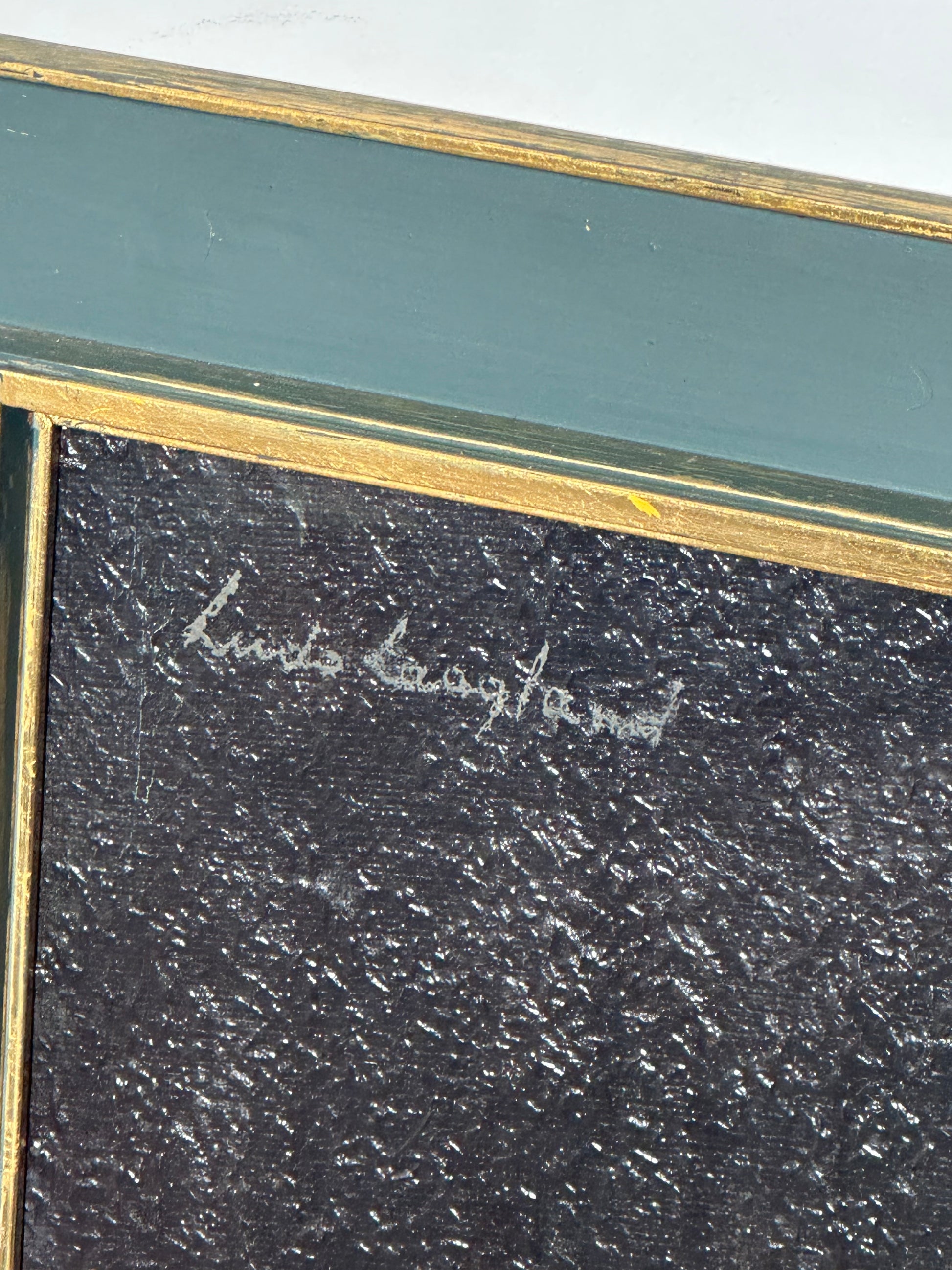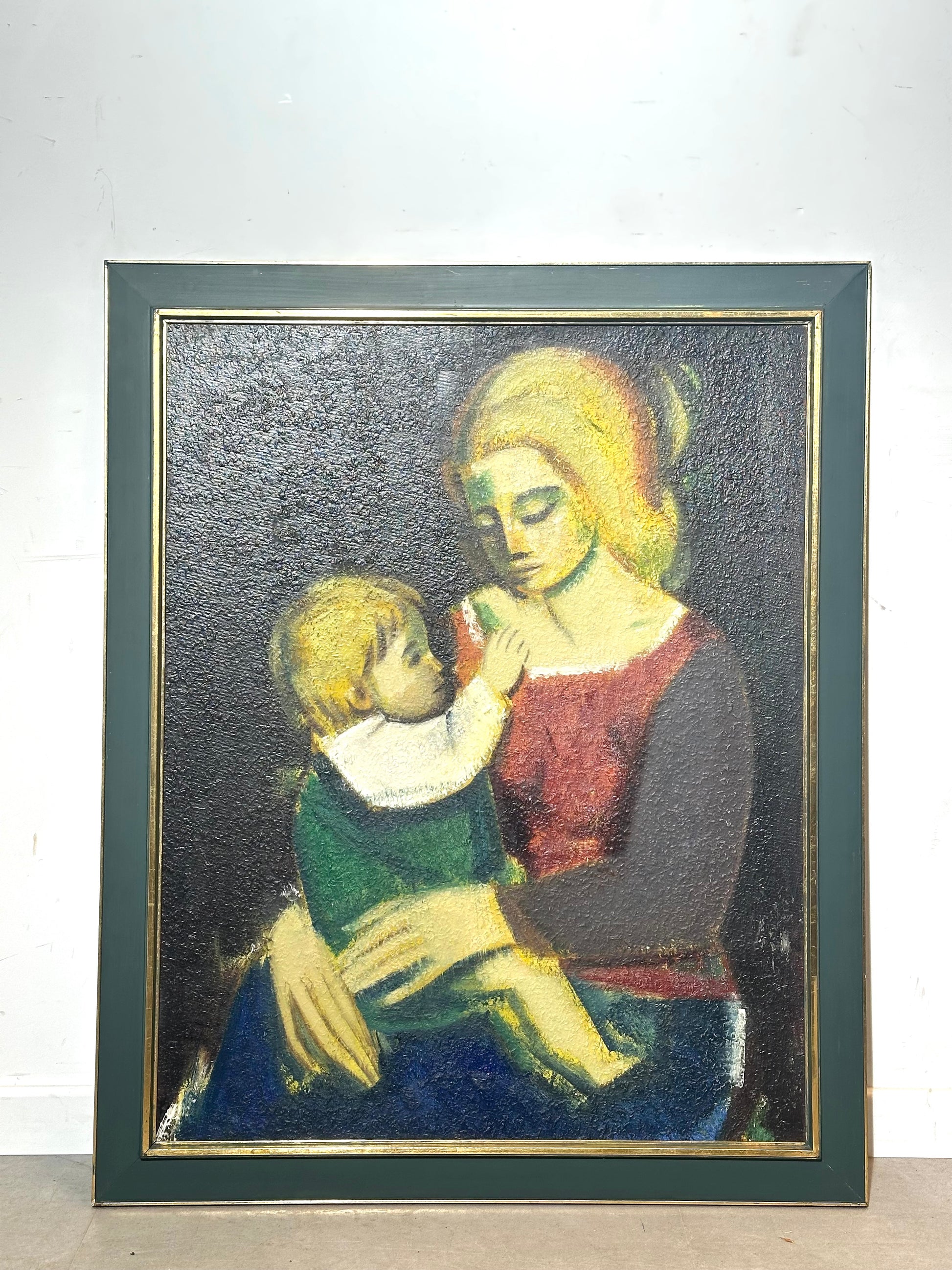The surface shows a pronounced grain and texture, giving the work depth and a slightly matte, almost fresco-like appearance. The painting is signed in the upper left corner and presented in its original period frame with a green and gilt finish, which complements the tones of the artwork beautifully.