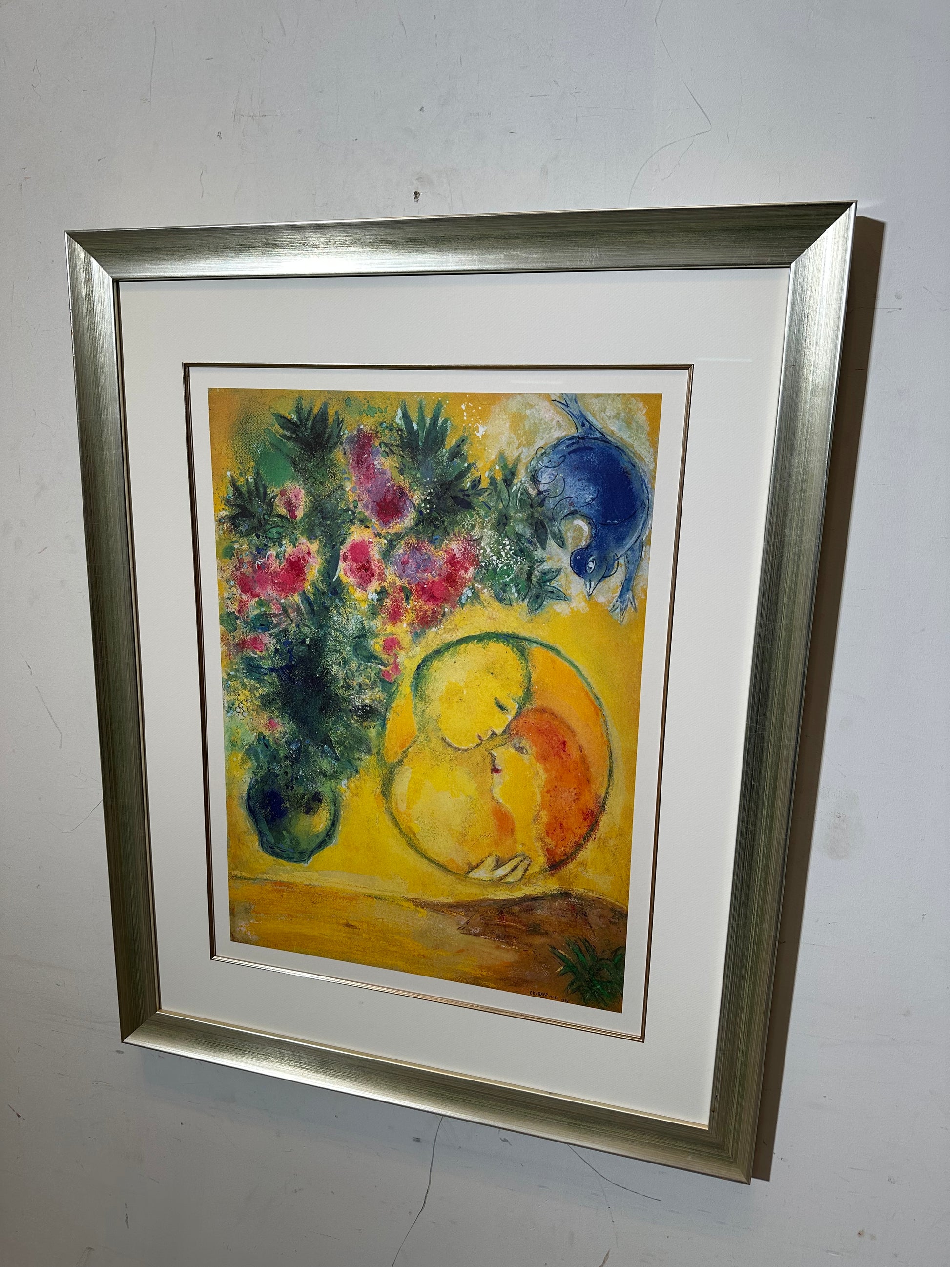 Vibrant framed reproduction after Marc Chagall (1887–1985), one of the greatest modernist painters of the 20th century. This artwork, dated 1949, radiates Chagall’s signature dreamlike imagery: a tender depiction of a mother and child in warm golden hues, accompanied by a vivid bouquet and a whimsical blue bird.