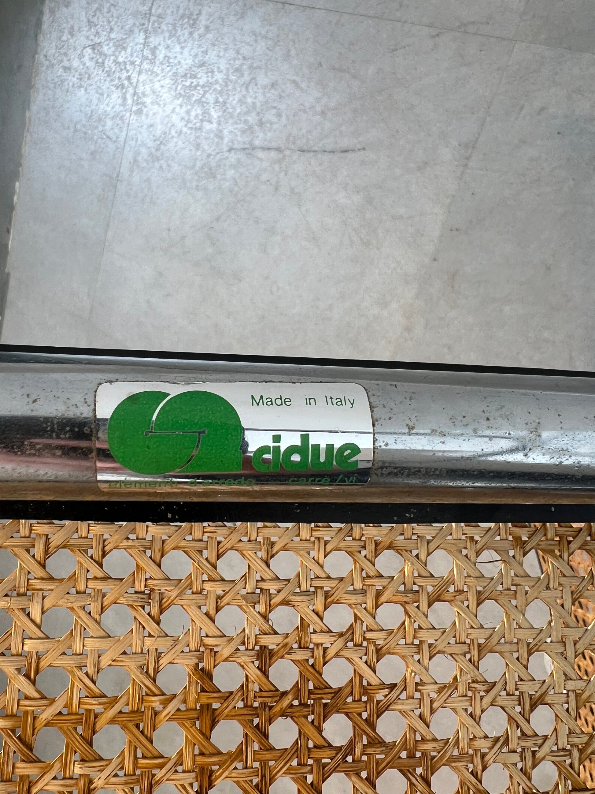 Elegant cantilever chair in the style of Marcel Breuer’s iconic Cesca design, produced in Italy by GiDue. This timeless mid-century design features a chrome tubular steel frame combined with a woven cane seat and backrest, framed in black wood.