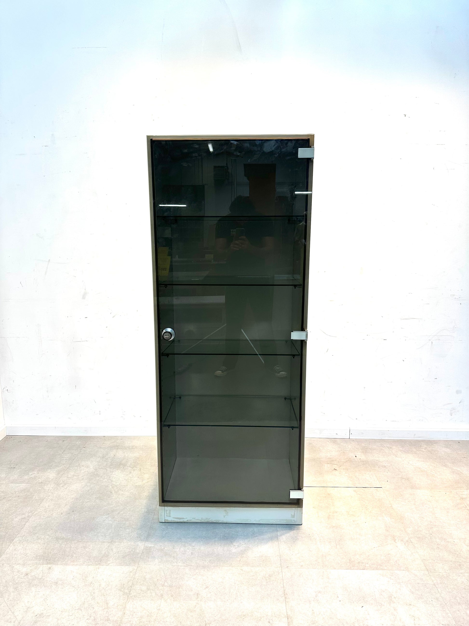 Add a touch of sleek industrial elegance to your space with this vintage glass display cabinet. Featuring a sturdy metal frame and smoked glass door, this piece is both practical and stylish. The interior is fitted with glass shelves, making it perfect for showcasing collectibles, books, or decorative objects. Its minimal design and smoked glass finish give it a modern yet timeless appeal.