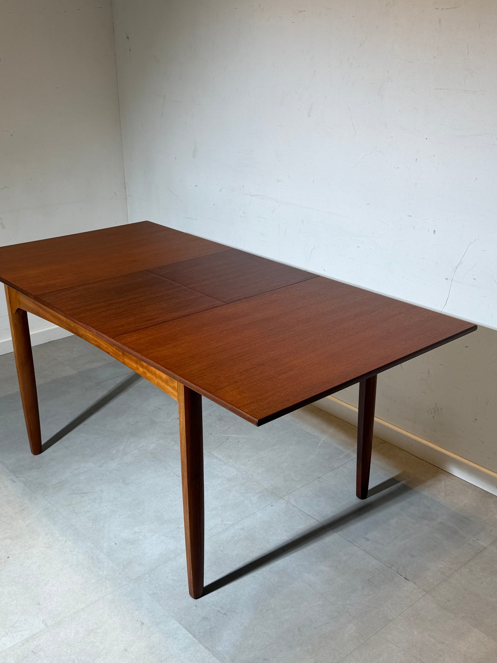 The teak surface has been professionally restored, enhancing the natural grain and colour while preserving its vintage character. The extension mechanism runs smoothly and the table stands solid and stable in both configurations.