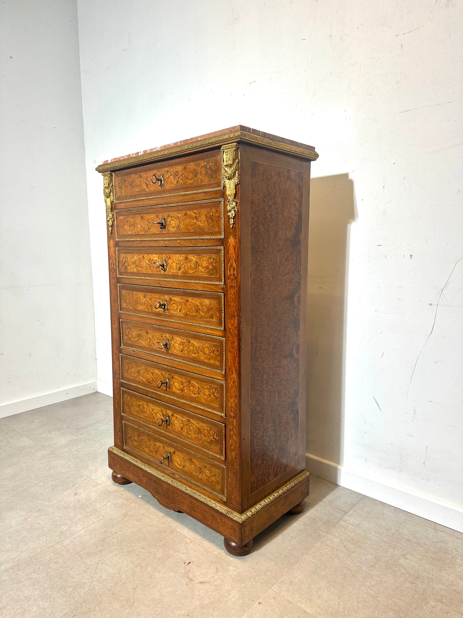 Elegant 19th-century French Napoleon III chiffonnier (tall chest of drawers) featuring fine boulle-style floral marquetry and rich gilt bronze (ormolu) appliqués. This refined piece showcases exceptional craftsmanship with detailed inlays, burled wood veneer, and high-quality bronze mounts in classical motifs. The original red marble top completes the luxurious presentation typical of the Second Empire period.
