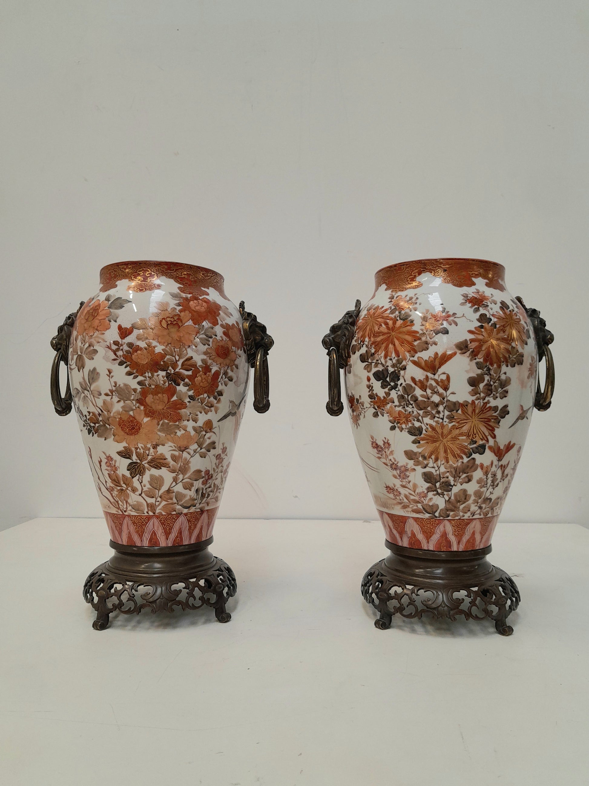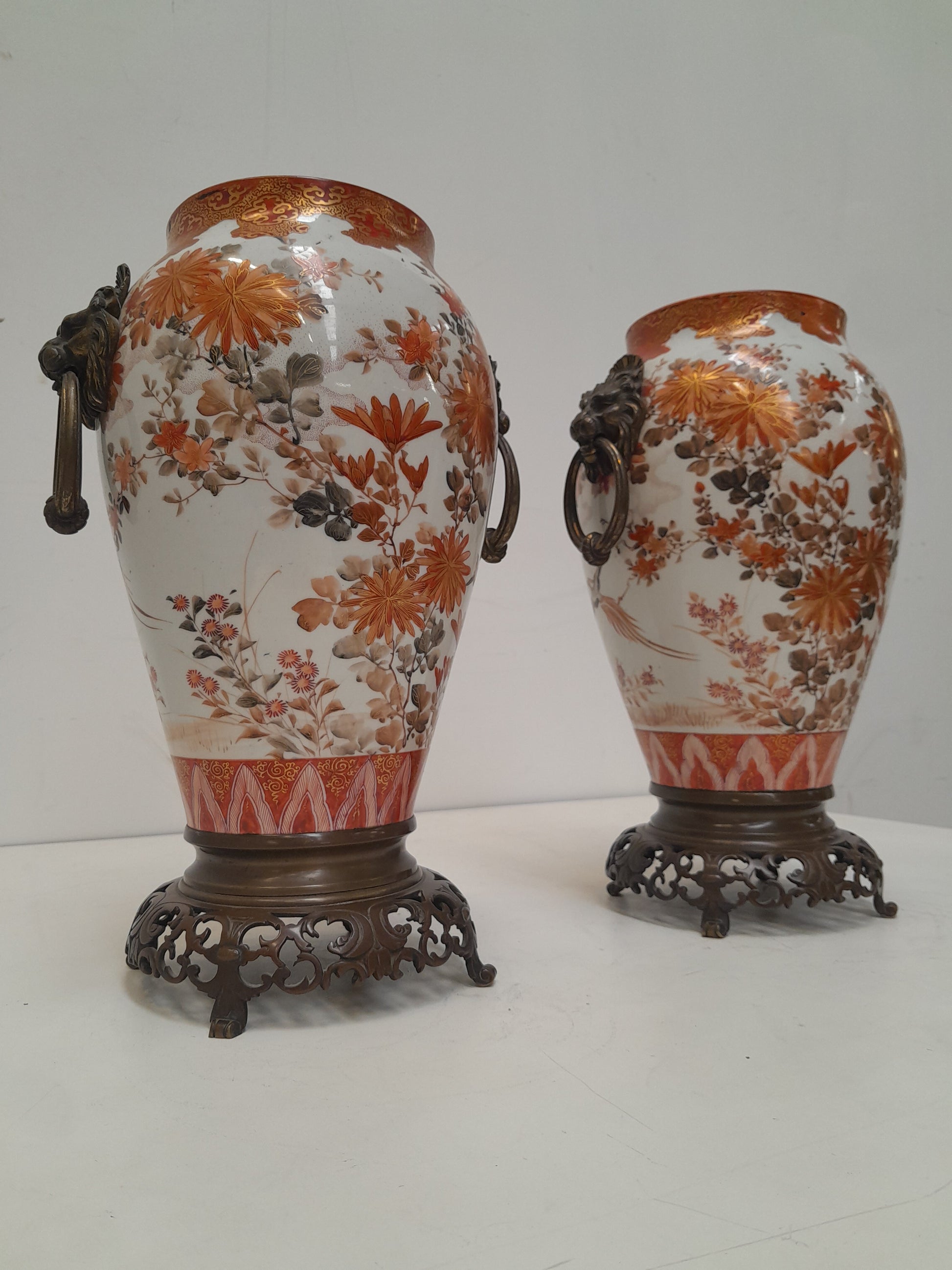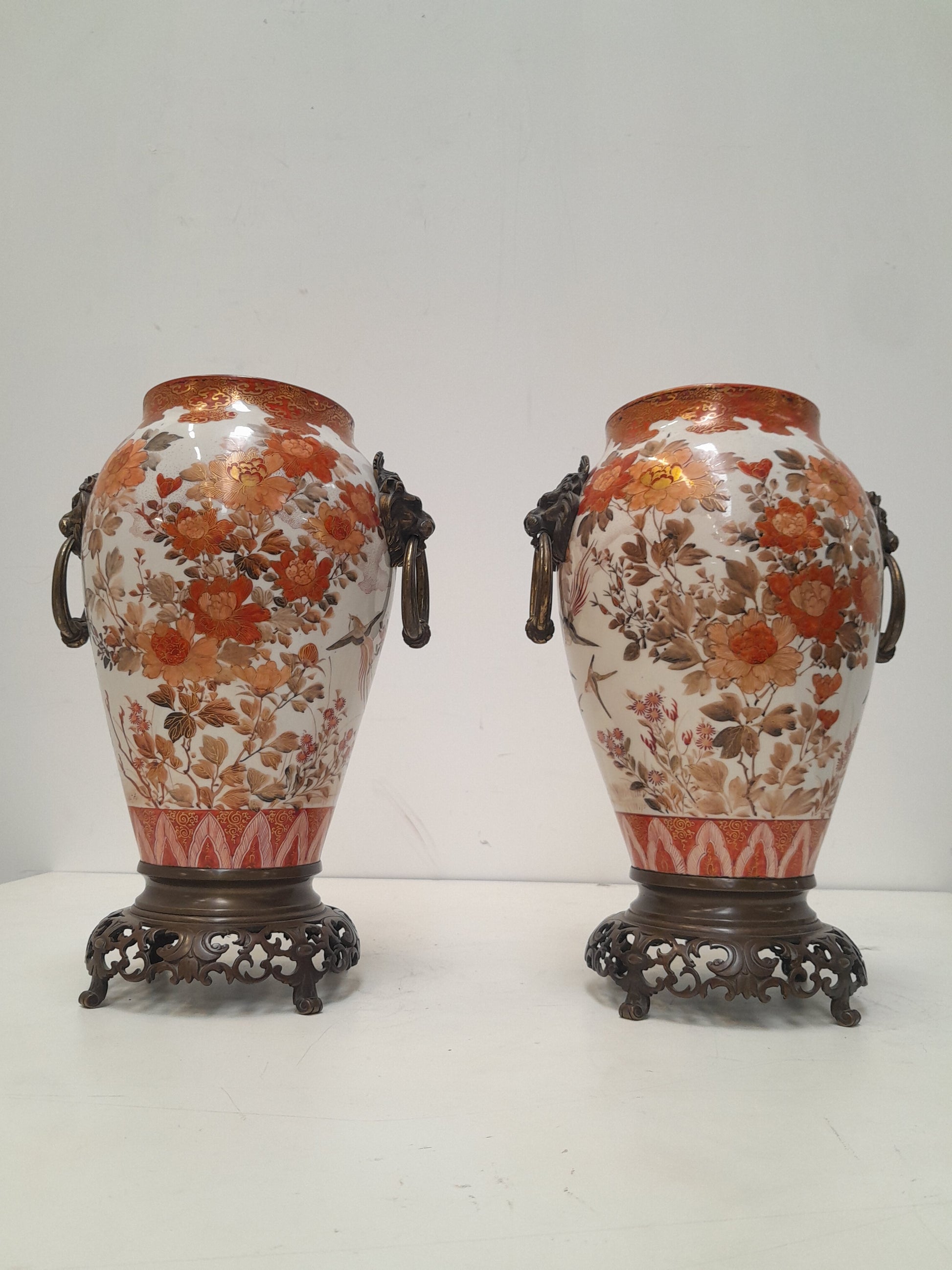 Pair of antique Kutani vases on a bronze foot and with bronze lionhead rings.