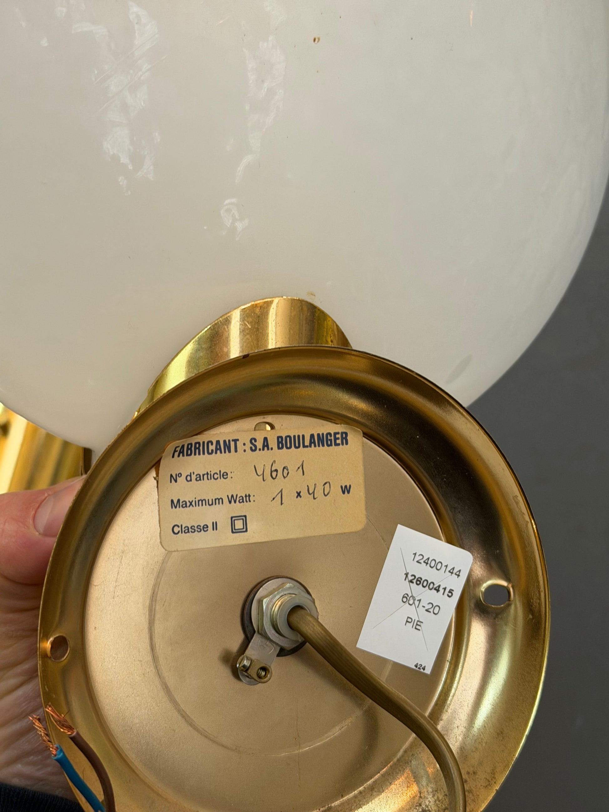 Elegant pair of vintage Boulanger wall sconces featuring a warm brass finish and large frosted glass globe shades. A timeless design that brings a soft, diffused light—perfect for a hallway, bedroom, living room, or as matching bedside wall lights.