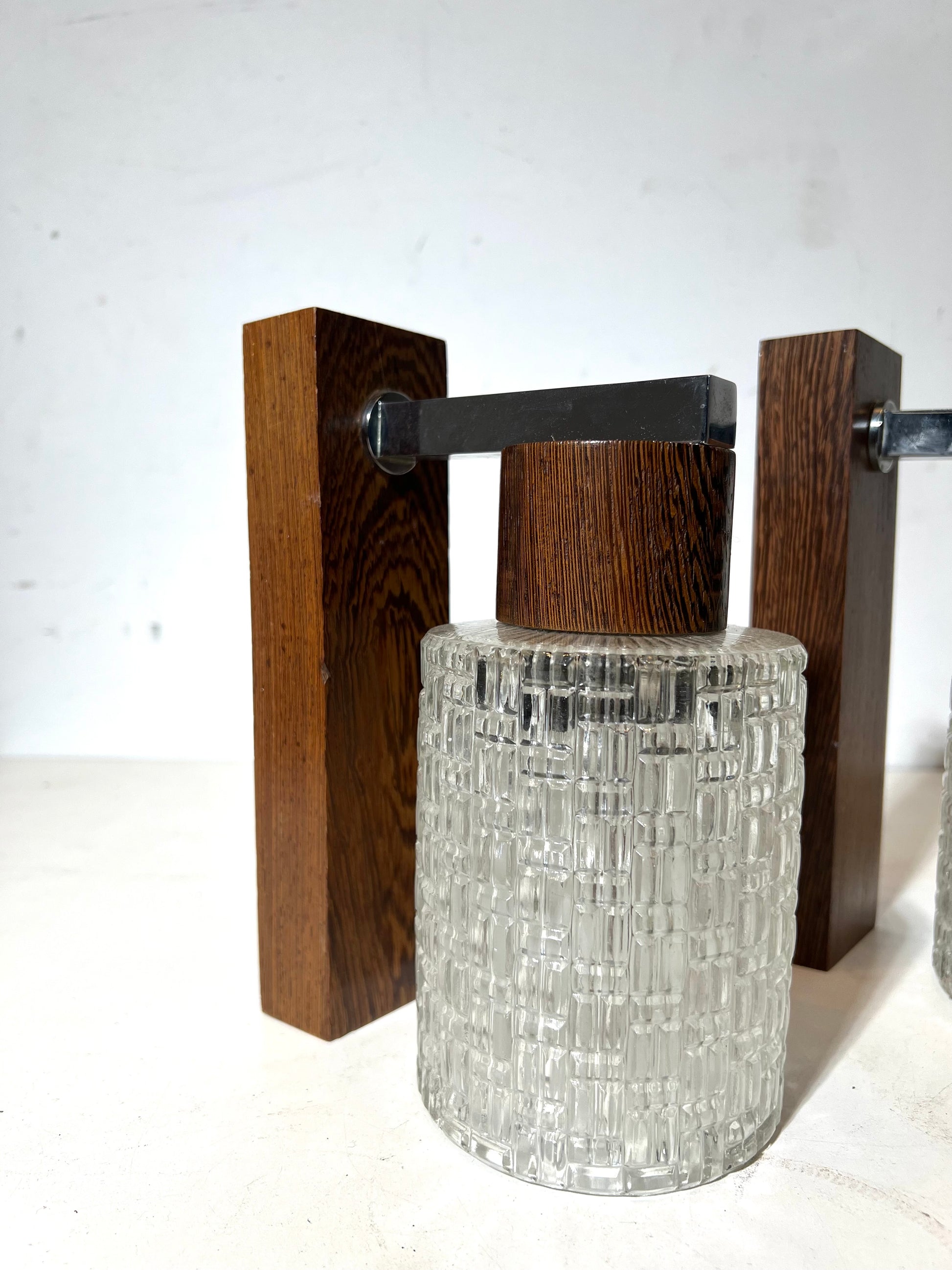 A beautiful pair of vintage wall sconces combining textured glass, and minimalist metal arms. These lights feature a warm, architectural design where the cylindrical pressed glass shades are suspended from clean-lined wooden supports, creating a refined balance between natural and industrial materials.