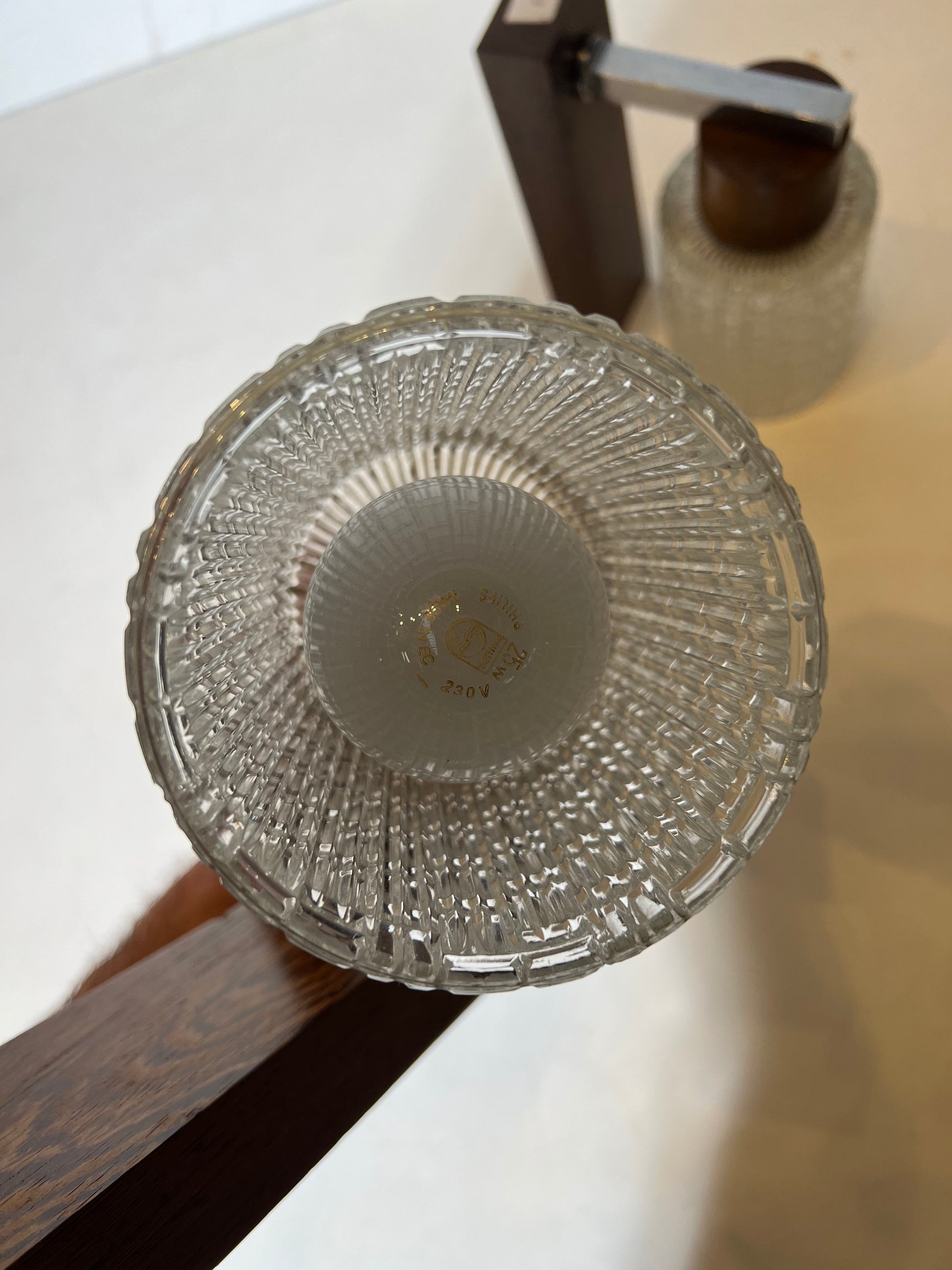 Good vintage condition with light signs of use. Minor wear on the wood and metal consistent with age. Glass in very good condition. Wiring present but should be checked/installed by a professional before use.