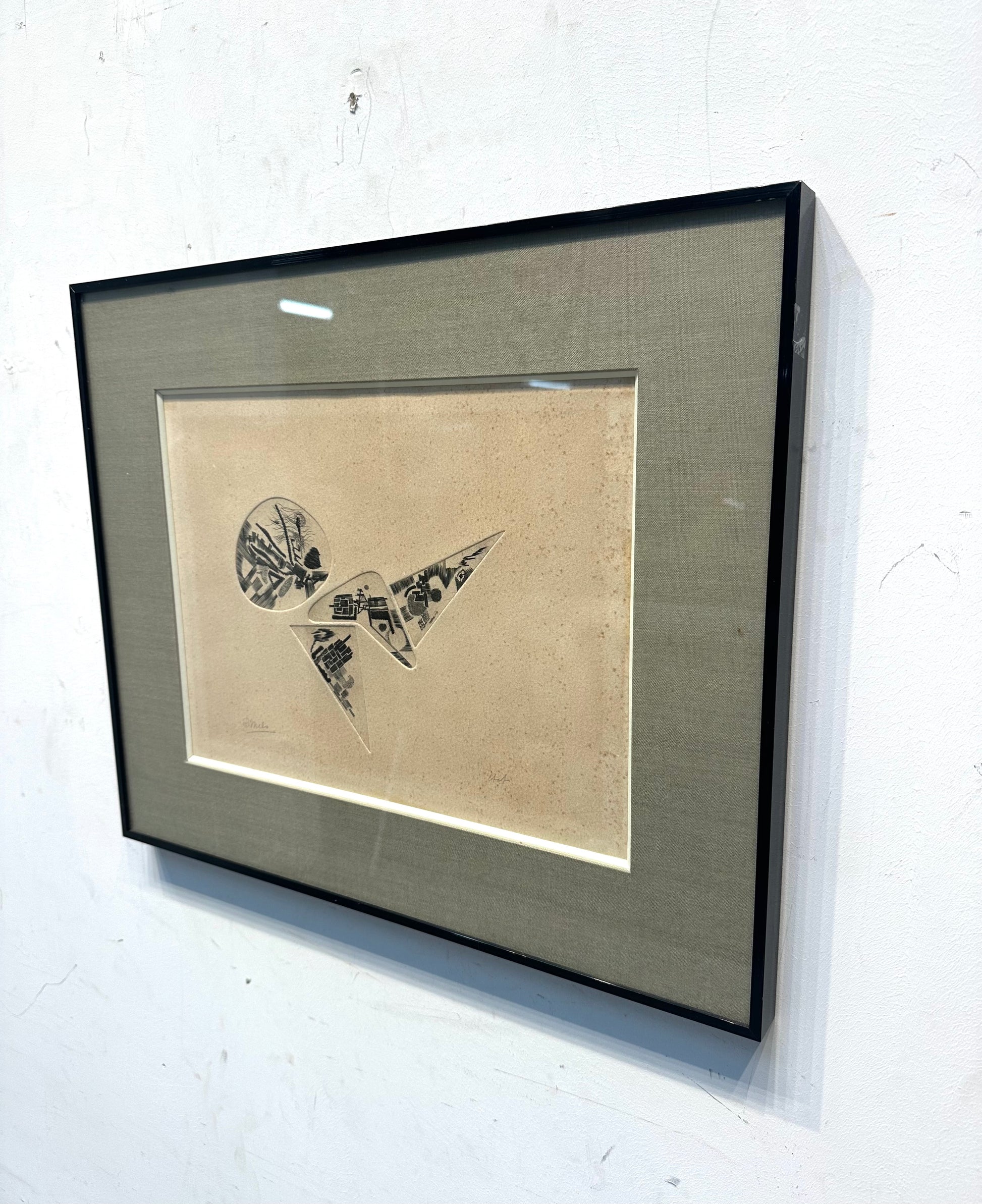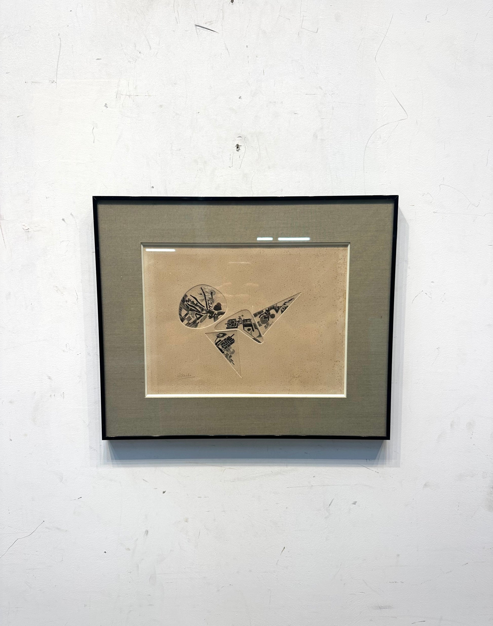 This etching is hand-signed by the artist in pencil and presented in a minimalist black frame with a grey linen mat. Subtle aging of the paper adds to the work’s authentic vintage character.