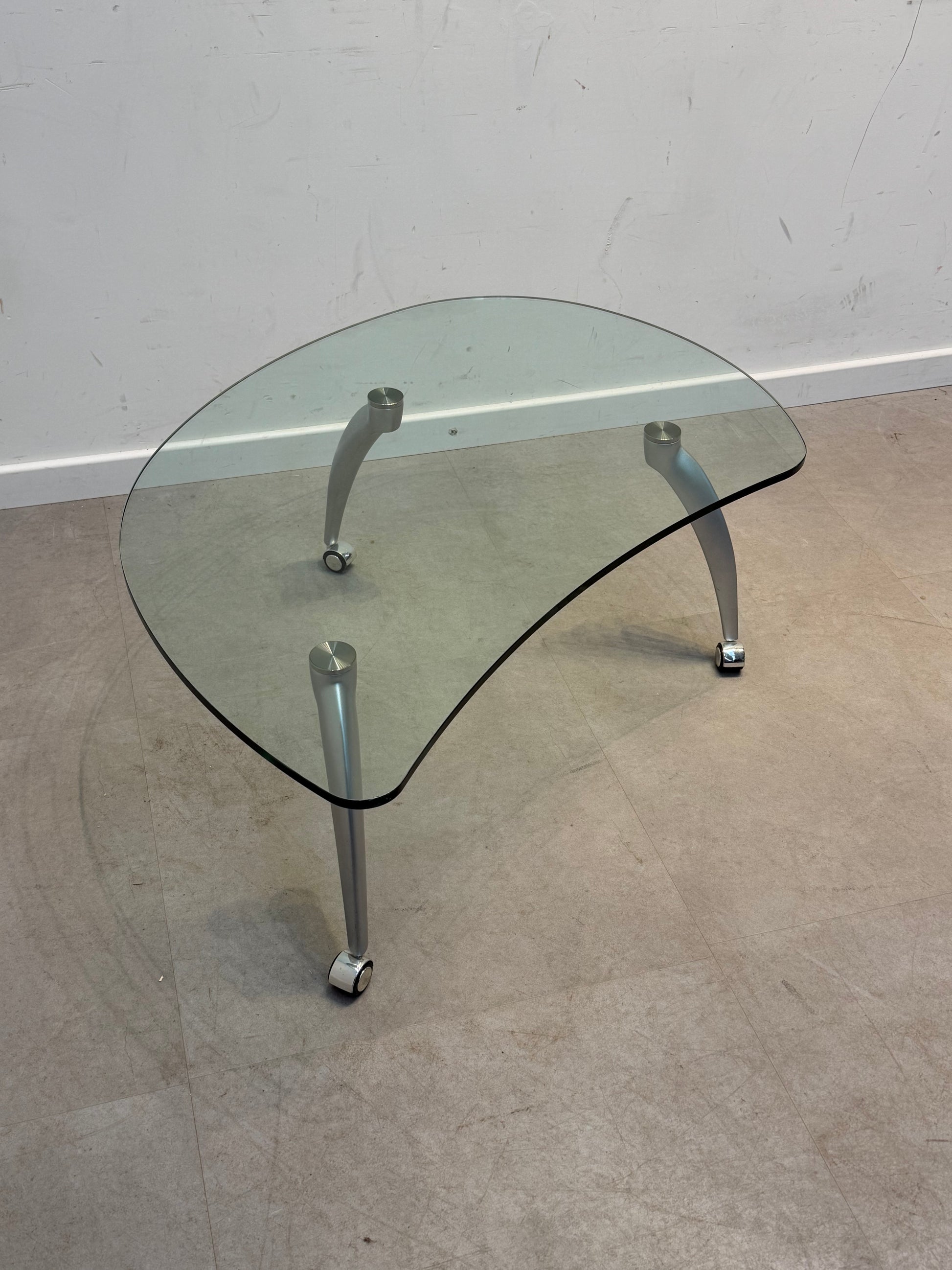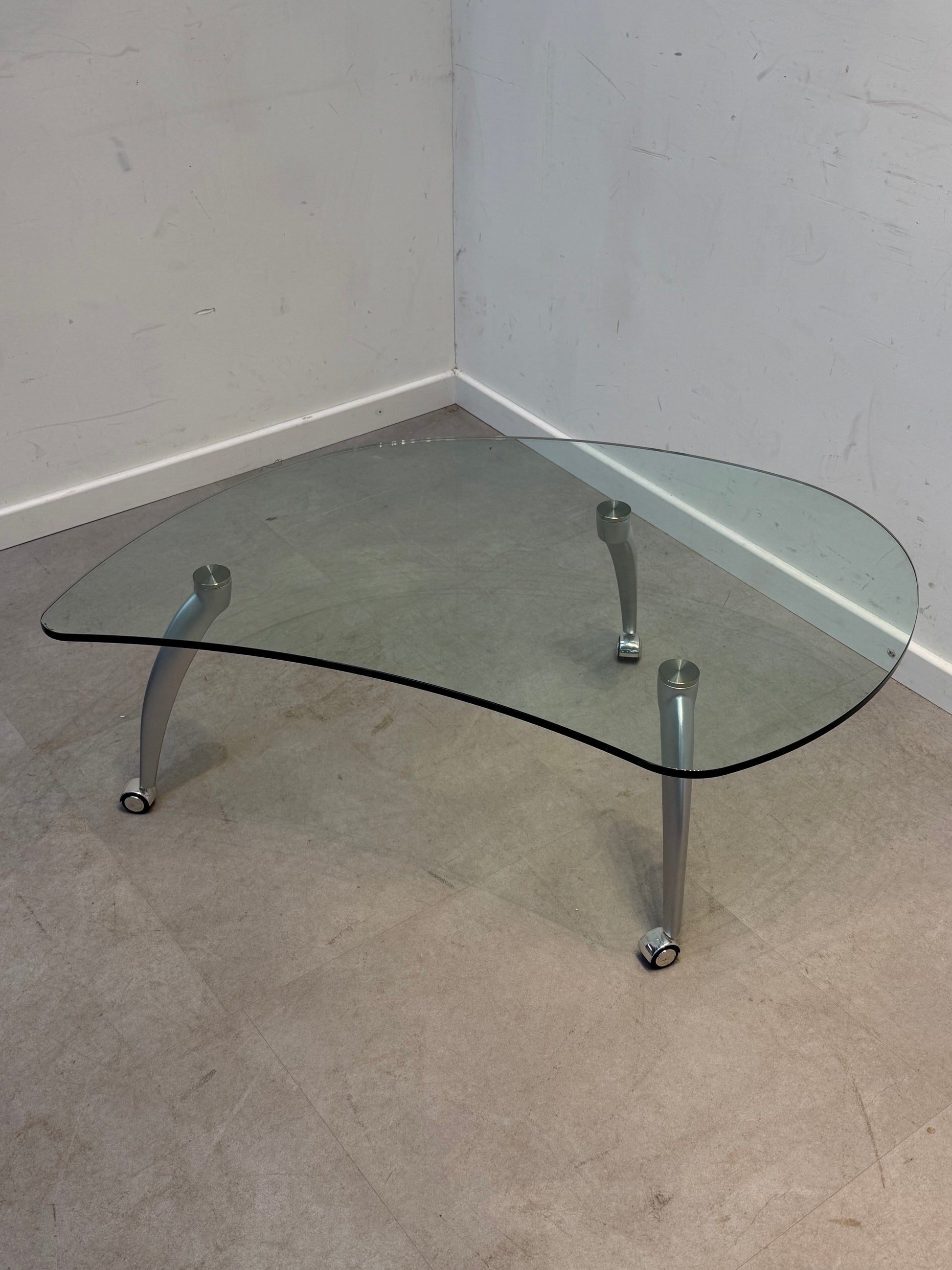 Elegant and modern coffee table by Rolf Benz featuring a thick smoked glass top with soft organic lines. The sculptural aluminium legs are finished with integrated wheels, making it easy to move around while staying stable in use. A perfect statement piece for a contemporary living room, lounge or design-focused interior.