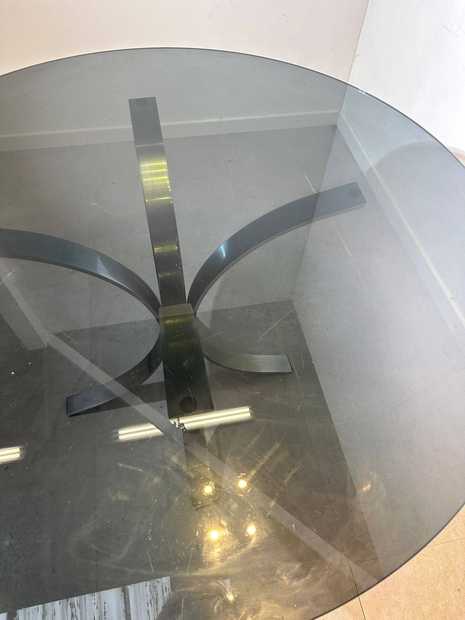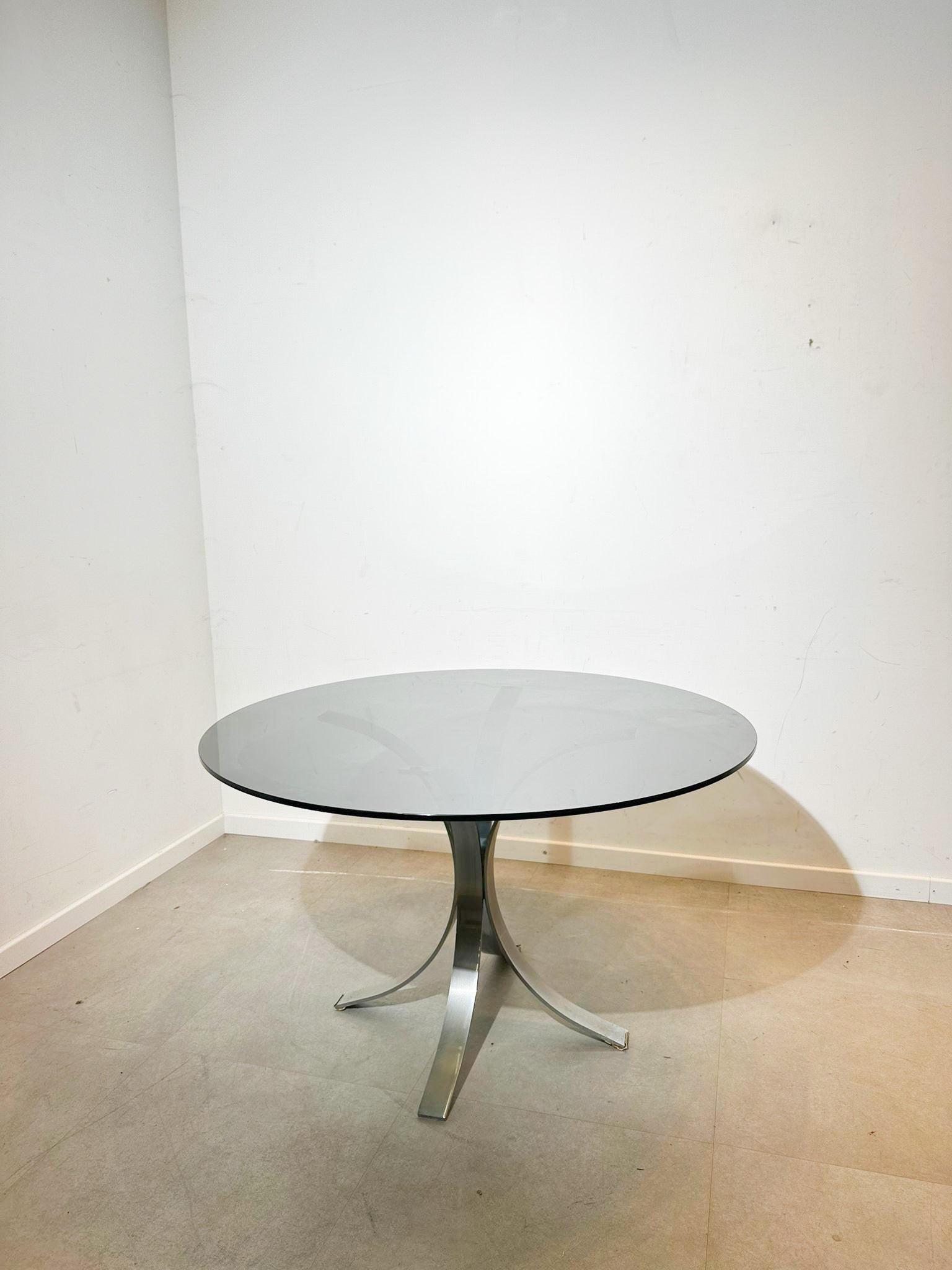 A sleek and refined round dining table featuring a sculptural metal base and a clean, minimalist silhouette. With its elegant tripod-style pedestal and balanced proportions, this piece carries strong stylistic cues reminiscent of Osvaldo Borsani’s designs—though it is not marked.