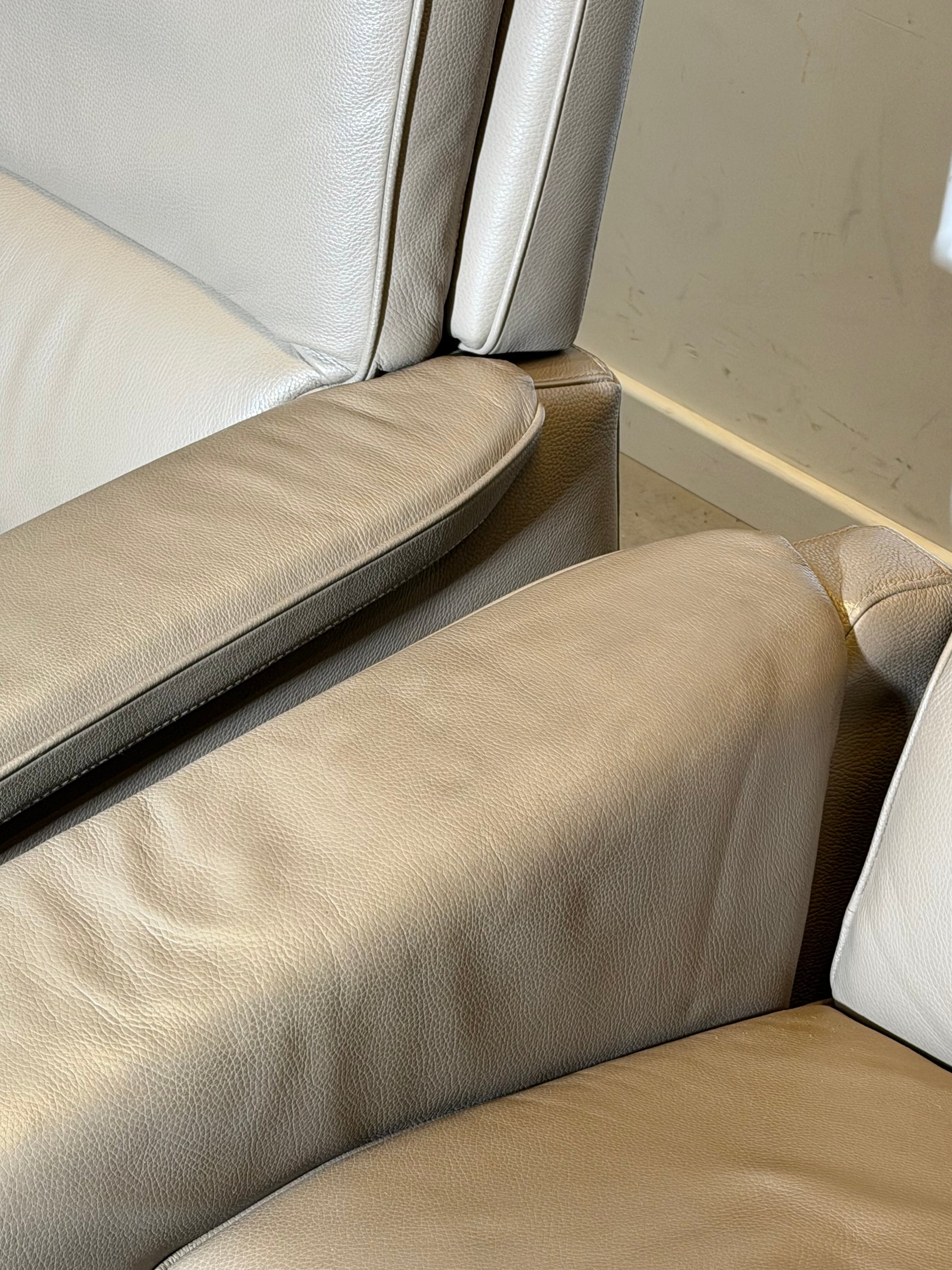 Comfort meets clean design with this set of 2 electric relax armchairs upholstered in taupe leather. Both chairs are in very good, clean condition and offer an electrically adjustable reclining backrest and seat position for optimal lounging. A great choice for a living room, reading corner, or home cinema setup.