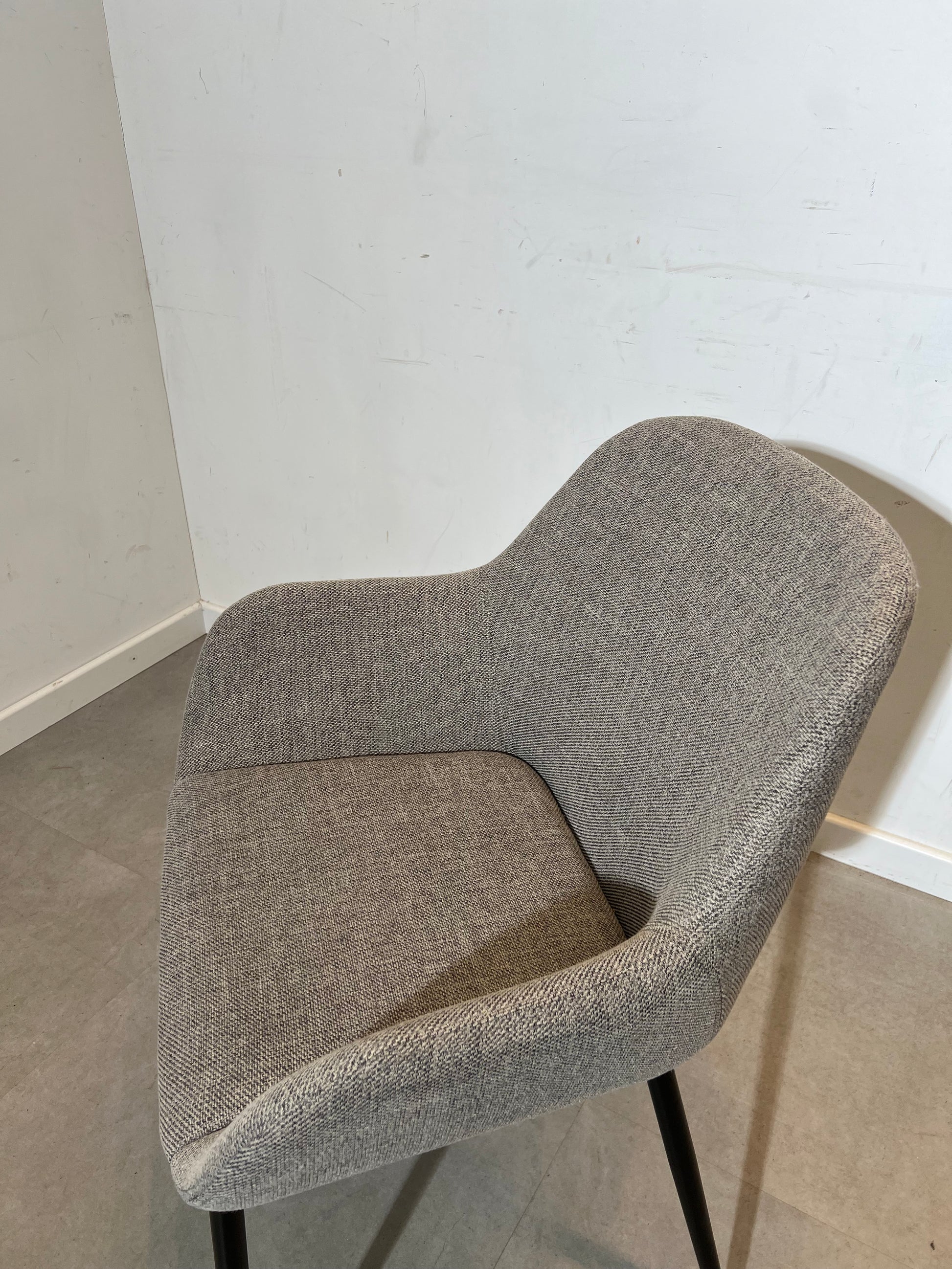 The curved backrest and integrated armrests provide excellent seating comfort, making them ideal for long dinners or as stylish accent chairs in a living space or office. The neutral grey fabric pairs effortlessly with many dining tables and interior styles.