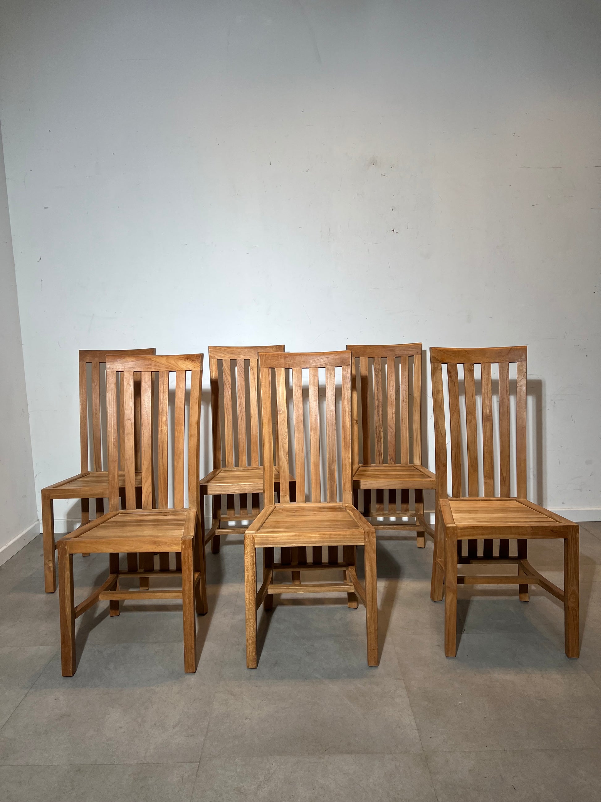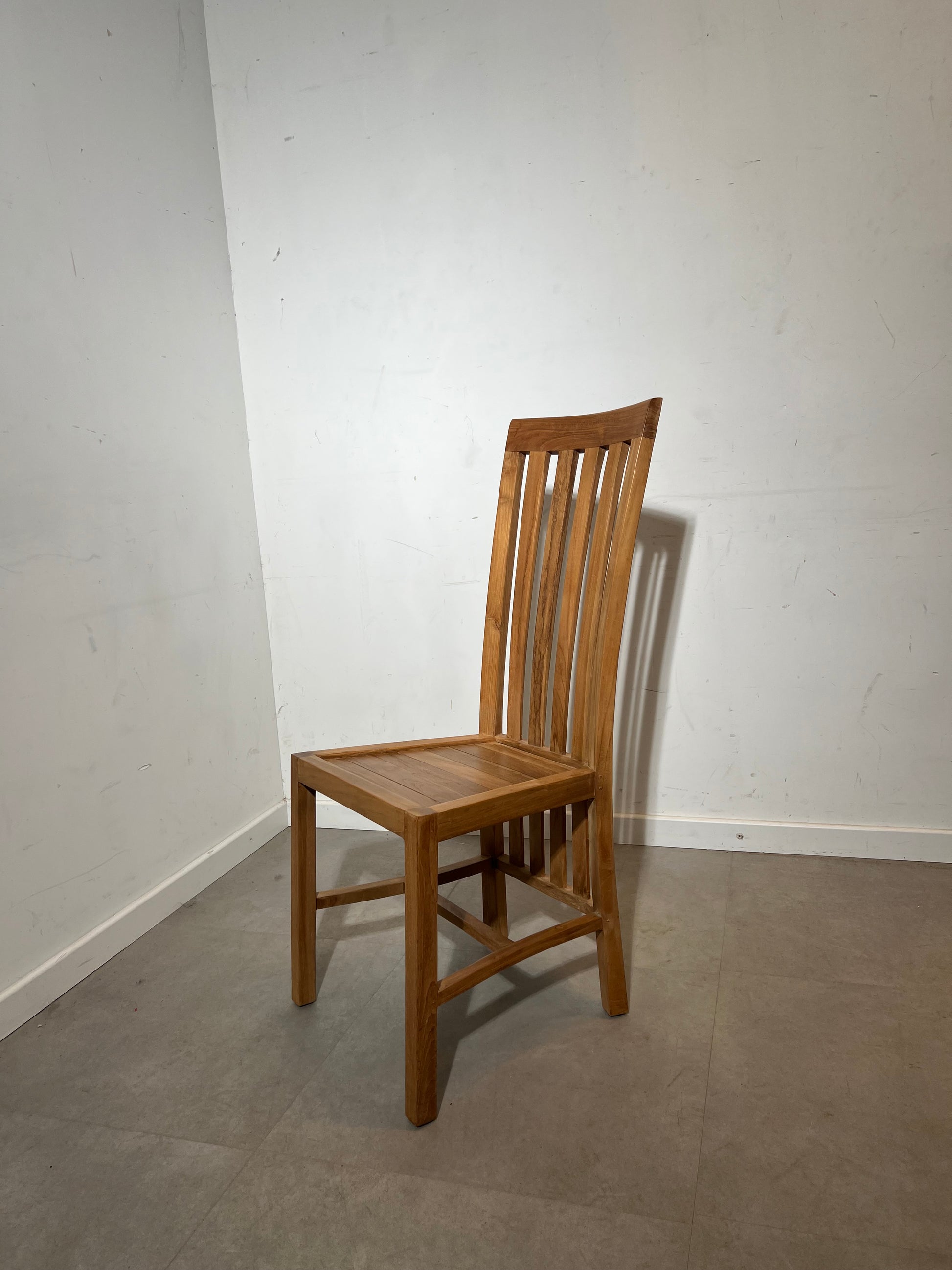 Beautiful set of six solid teak dining chairs featuring a timeless high slatted back design. The elegant vertical lines give these chairs a refined and architectural look, while the warm tone and rich grain of the teak create a natural, inviting feel.