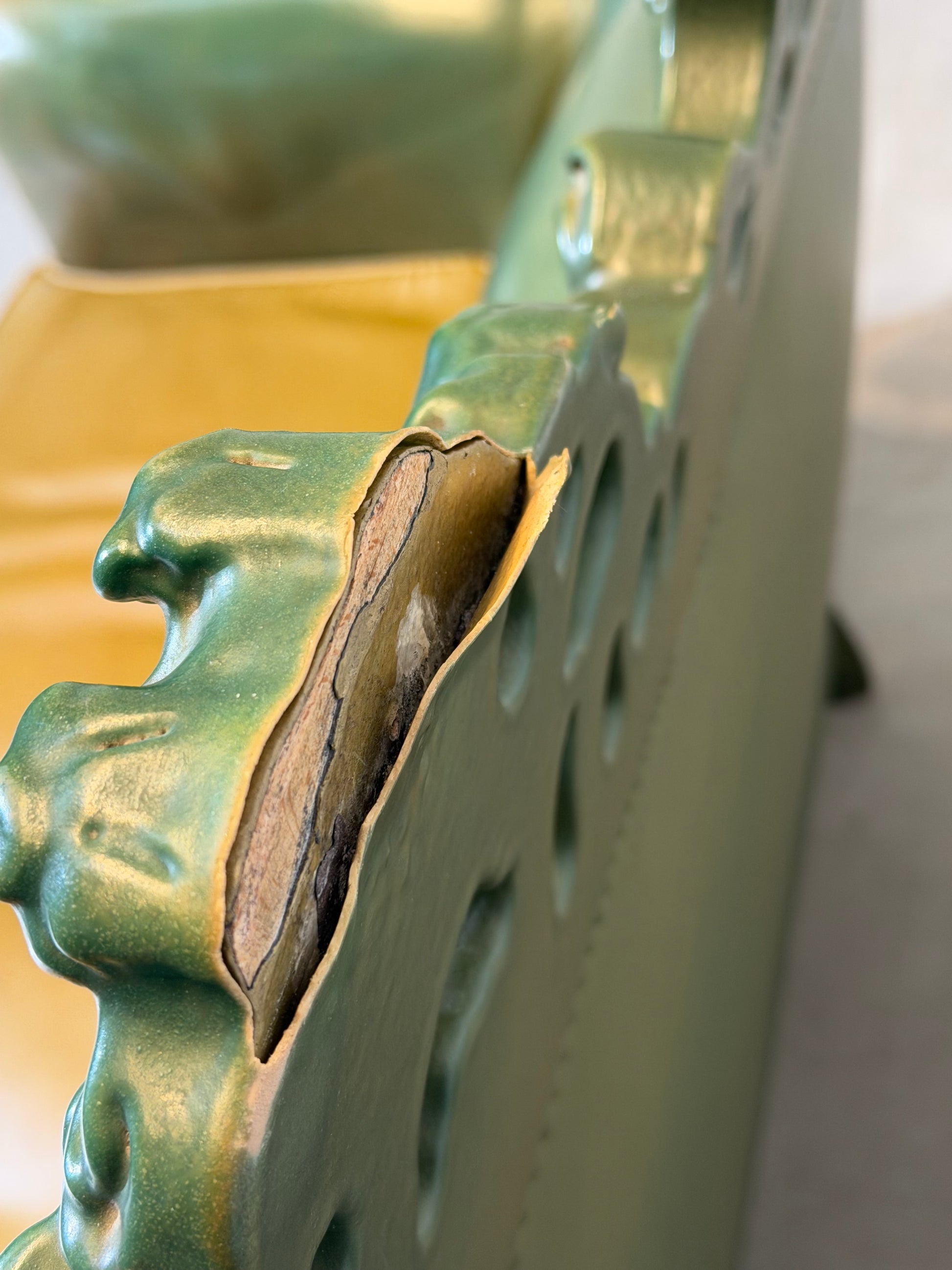 The sofa features an intricately molded frame with elaborate scrollwork, cabriole legs, and a richly detailed crest, finished in a deep green tone. It is upholstered in leather with three loose seat cushions in a warm ochre/tan color, creating a bold and sophisticated contrast.