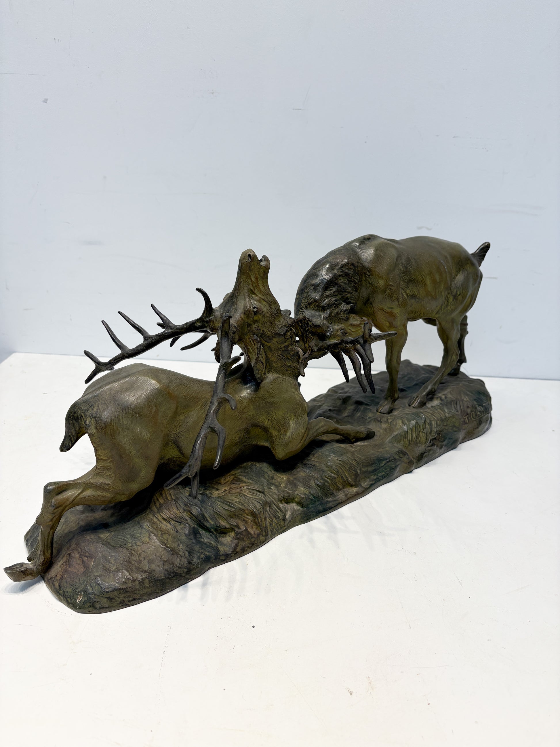 This exquisite bronze sculpture of two fighting stags is a masterpiece by renowned French sculptor Thomas Cartier (1879-1943), celebrated for his dynamic wildlife creations. The statue captures the raw power and energy of the stags in a moment of fierce combat, showcasing Cartier's incredible attention to detail and lifelike artistry.